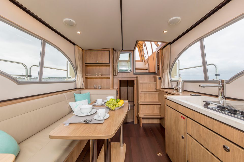 When you enter the motor yacht, you will notice the spacious headroom of almost 2 meters. There is a cozy sitting area with leather upholstery and a dining table, where you can prepare your route or watch television. The kitchen (or in ship's language, galley) is fully equipped with cooking utensils, coffee maker, kettle, etc. There is also a refrigerator with freezer compartment and a three-burner gas stove.