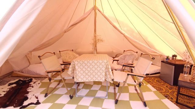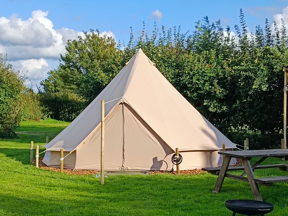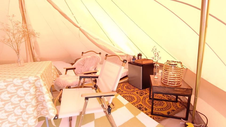 The spacious bell tent offers space for four people. Inside you will find a table, chairs, lighting, a fridge and an electricity connection. Outside you have your own picnic table and fire pit. The adjacent shared outdoor kitchen is fully equipped with everything you need to cook. The sanitary building with free showers, toilets and washing up area is a short distance away.