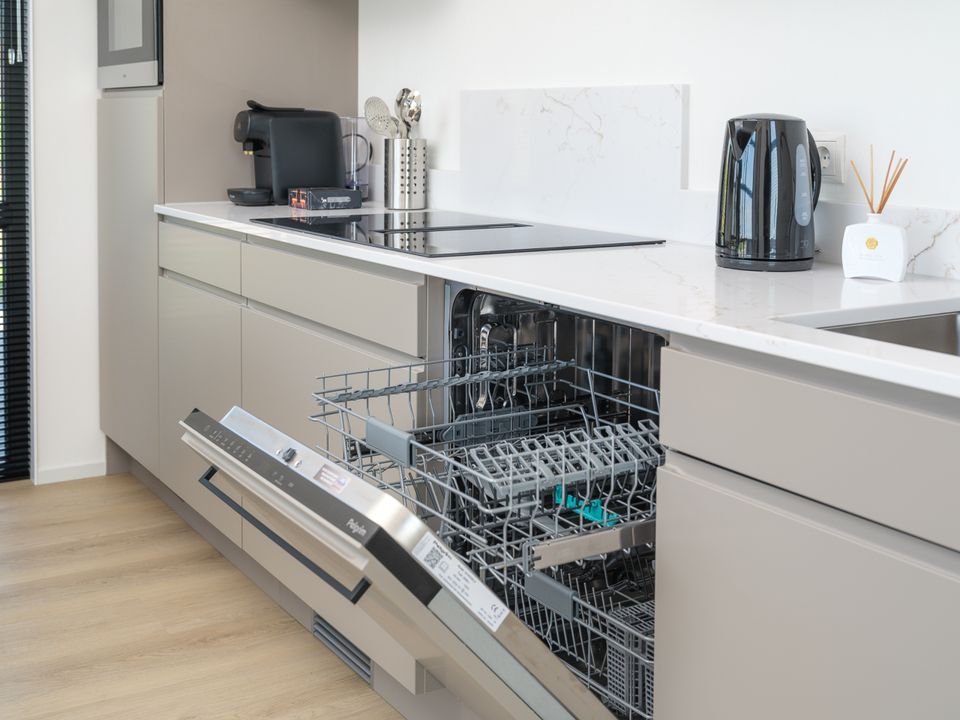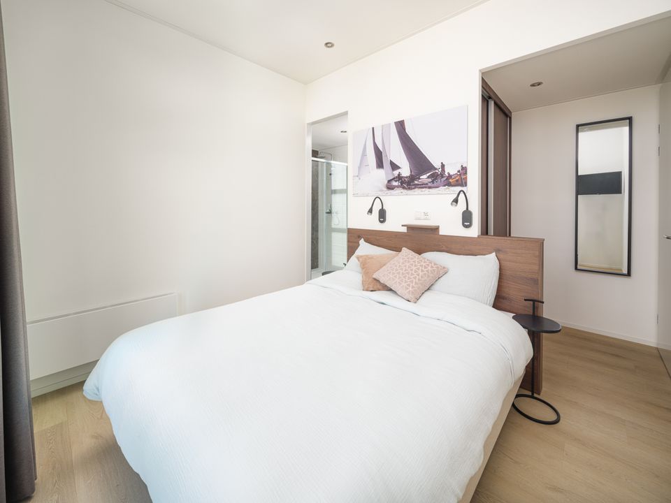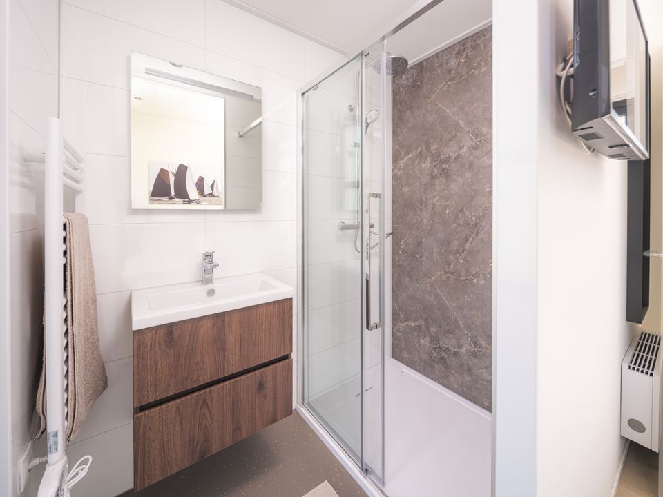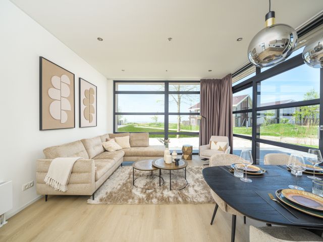 Villa Meerzicht is on the ground floor and features a bright living room with a sitting area, television, and dining table. There are two bedrooms with box-spring beds, each with its own bathroom with a walk-in rain shower. Outside, there's a spacious garden with a terrace, dining table, lounge set, and parasol. The house has a private parking space and is equipped with solar panels and a heat pump.