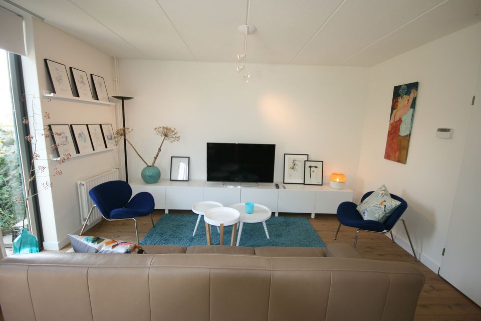 This nice house has a spacious driveway where two cars can be parked and a nice garden on the water. There are several seating areas in the garden and you have the option to moor your (rented) boat in front of the door! Due to the large sliding doors and many windows, this house is light and sunny. The living room is cozy with modern furniture and comfort. You can dine at the round table that is also in the living room. There is a spacious corner kitchen with a large oven, gas hob and fridge with separate freezer. Three bedrooms have been realized on the first floor, two of which have a double box-spring bed. The third bedroom is slightly smaller and has a single box-spring bed. There is also a spacious, modern bathroom on this floor. This bathroom has a bath/shower, toilet and sink. In addition, there is a second toilet on the ground floor and a washing machine in the storage room.
