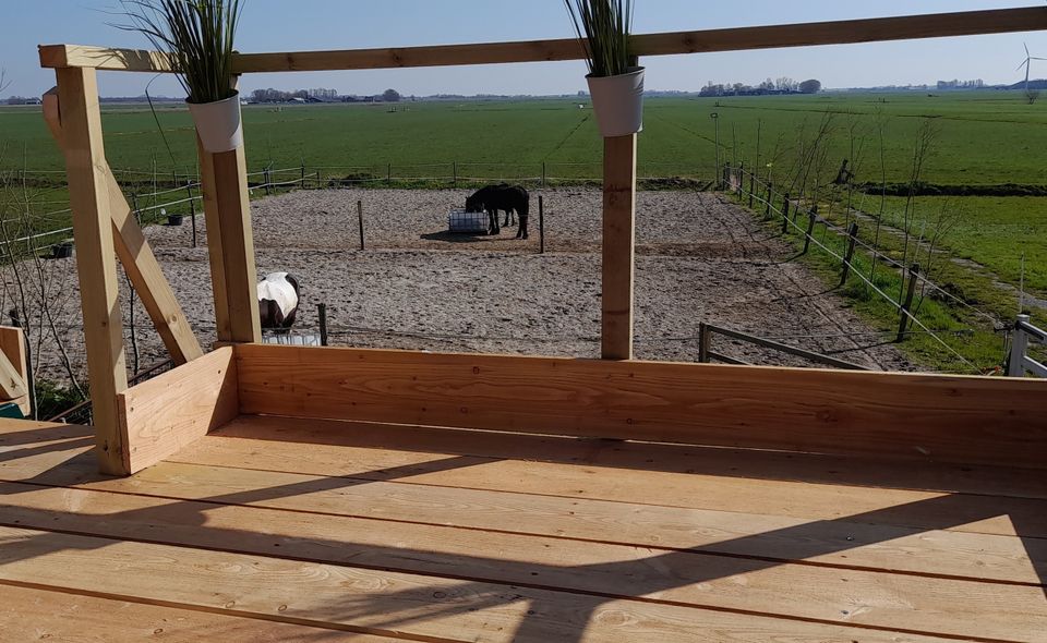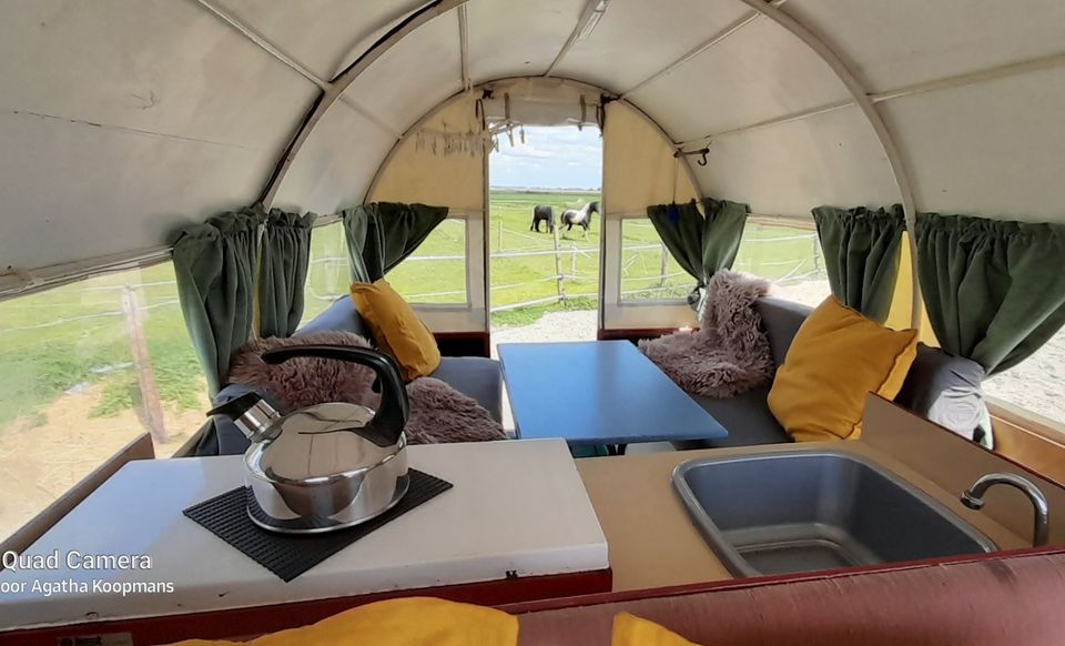 Looking for a unique overnight stay? Then this old covered wagon might be something for you! The basic covered wagon is located in nature near a horse stable. The covered wagon is suitable for two people and consists of one room. In this room is a cozy sitting area which can easily be converted into a bed in the evening. There is also a small kitchenette without a gas stove with running water. due to the insurance may not be cooked there. There is also a toilet in the covered wagon, and you take a shower at the cold outdoor shower. There is also an eco toilet outside. Adjacent is the picking garden. Here you can pick mint for mint tea, herbs, etc. A staircase leads through the garden to the roof terrace where you can enjoy a beautiful view over the meadows. Early in the morning you can often see deer and other wild animals during the sunrise. Water comes from our own source, but is not nice to drink. It is best to bring your own bottles, but water is also for sale at the location. This accommodation can be described as a hiker's cabin/nature house, but with the luxury of electricity and a made bed. Back to basics. Not suitable for guests with entomophobia or insect aversion.