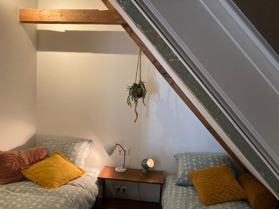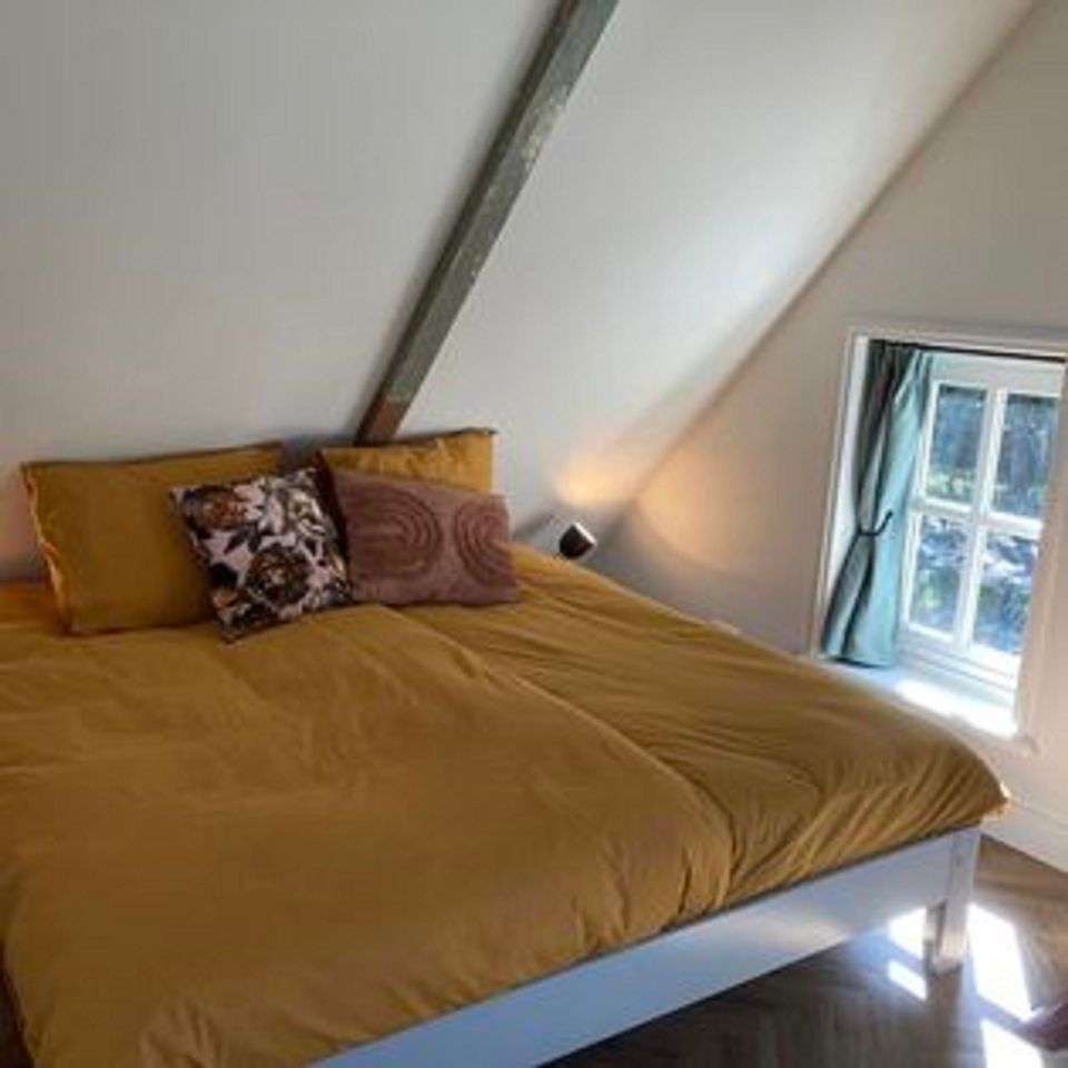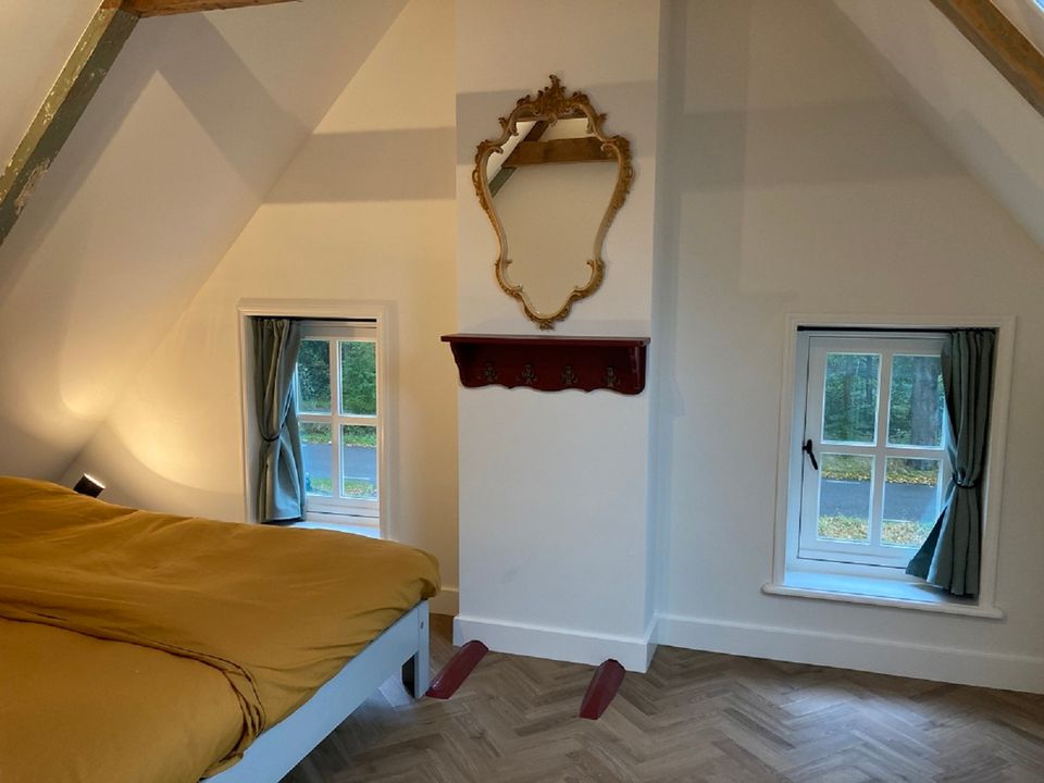 The front section of this stately head-neck-body farmhouse from 1875 is available for rent as a B&B or holiday home. The front section was renovated in 2022; the original details have been preserved and restored to their former glory. The beautiful windows, authentic carpentry, and the box bed make this home unique. The upstairs room features a fully equipped kitchen including a dishwasher and a refrigerator with a freezer compartment. In the upstairs room, you can enjoy dining at the round table, sit comfortably around the fireplace, and watch a good film on television.