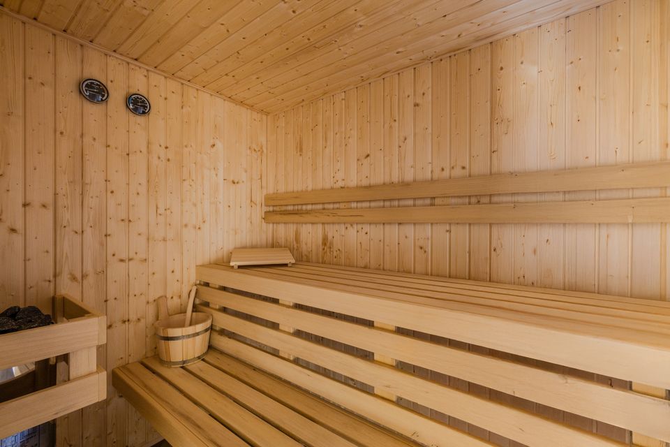Lodges are available with an outdoor or indoor sauna. The hotel room lodge has a bathtub on the deck.