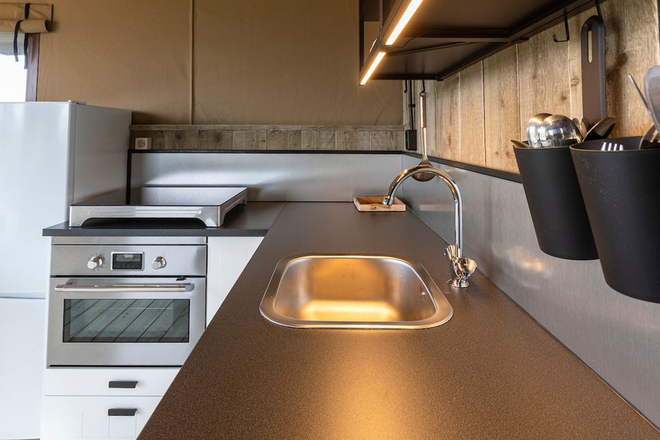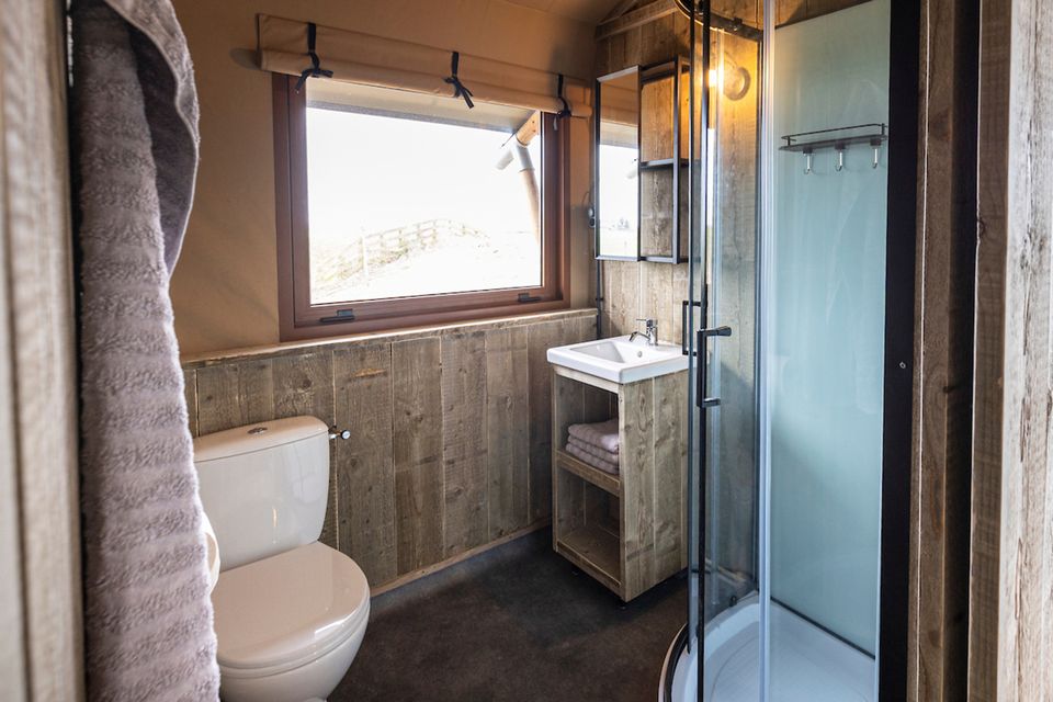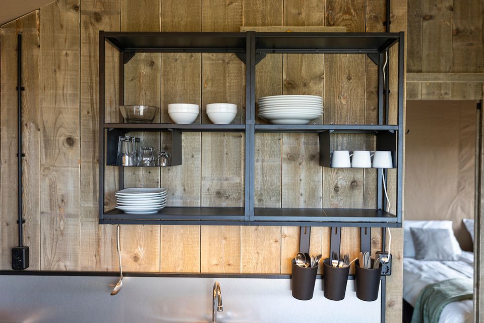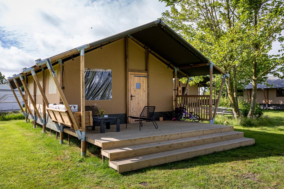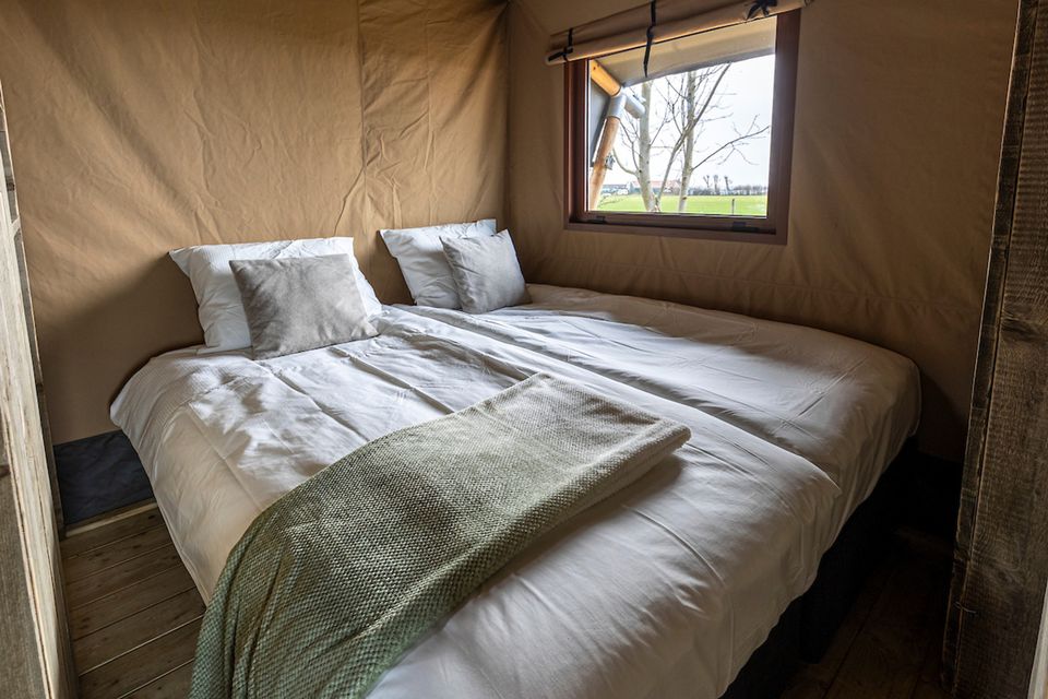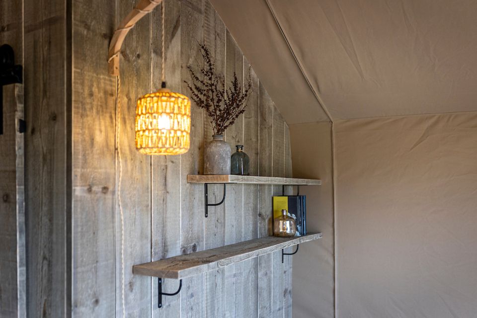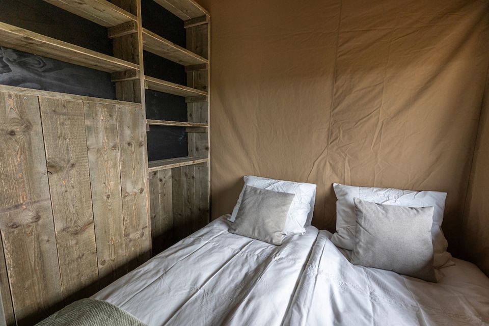 Gouden Plakje has had this spacious and brand new, completely and originally furnished glamping tent since 2024. Camping, but with luxury. With private sanitary facilities, dining and sitting area and comfortable beds in separate areas. The bathroom is equipped with a shower cabin, a toilet and a sink with mirror. The room can be heated. After a hot shower you are ready to go on an adventure. Or enjoy a fresh cup of coffee on your own veranda first thing in the morning.
