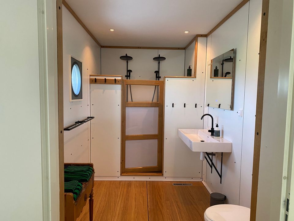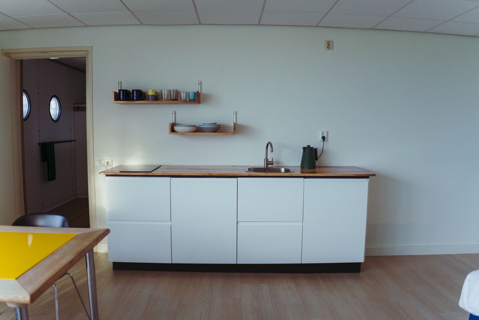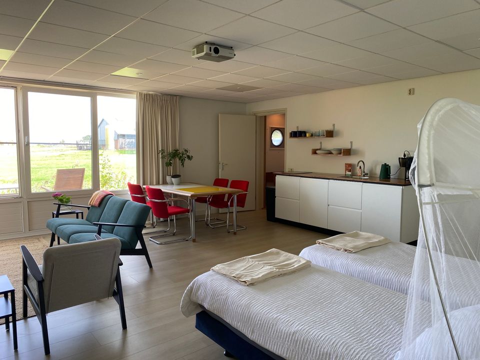 This lovely studio with large windows invites you to fully enjoy peace, space and nature. Enjoy the most beautiful sunsets from your own terrace. The studio is compact, but fully equipped with a seating and dining area. The sleeping area consists of two extra long box-spring beds (220x90 cm) and the kitchen is complete with refrigerator, induction hob and dishwasher. In the bathroom you will find a double shower, sink and toilet.