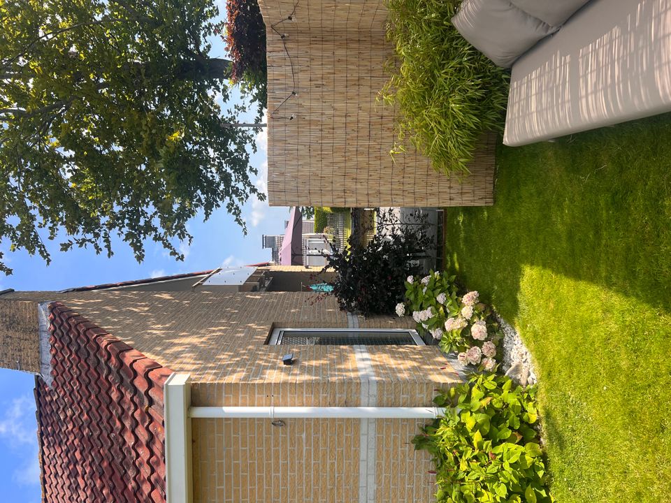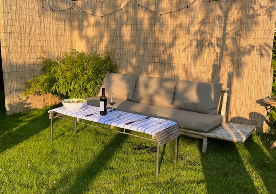 The large garden offers several terraces, so you can enjoy the outdoors at any time of the day. Relax on the lounge sofa by the water, share meals at the large dining table, or enjoy the evening sun on the sofa in the front garden.