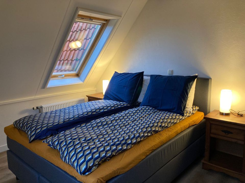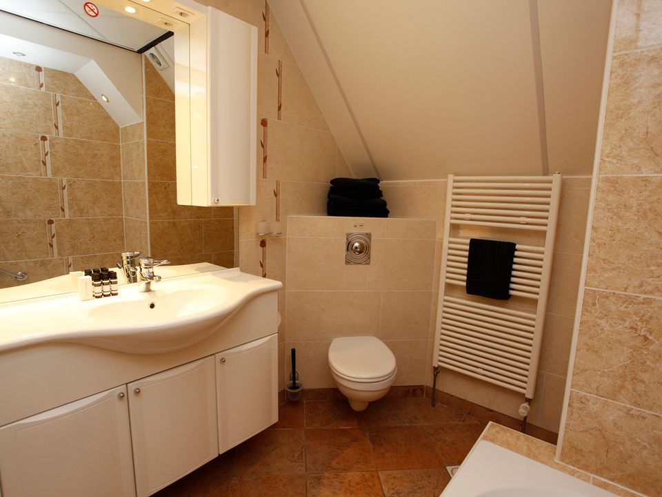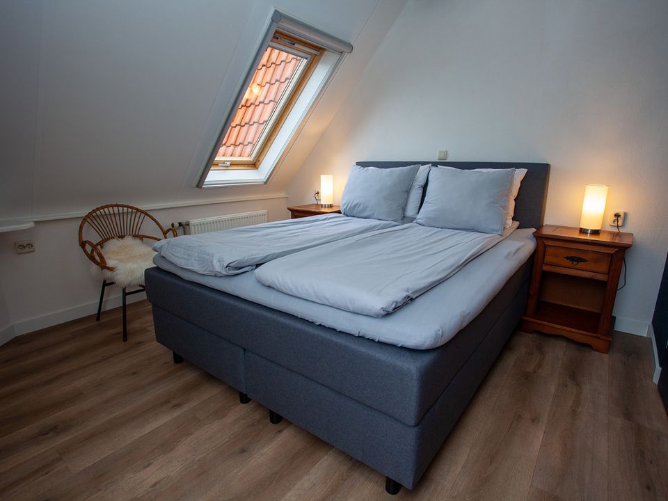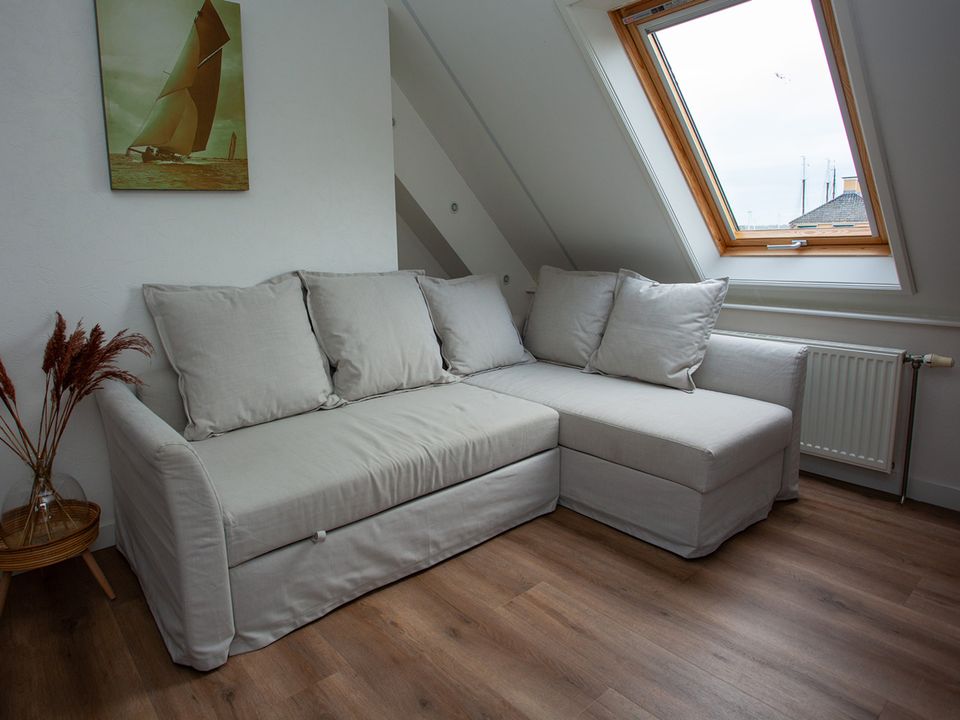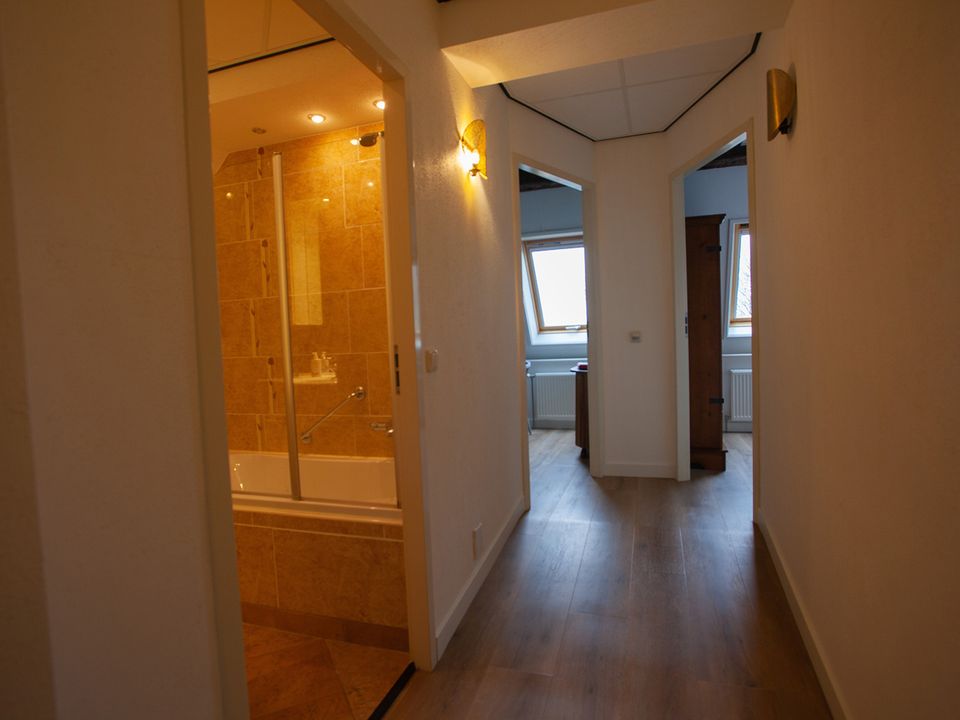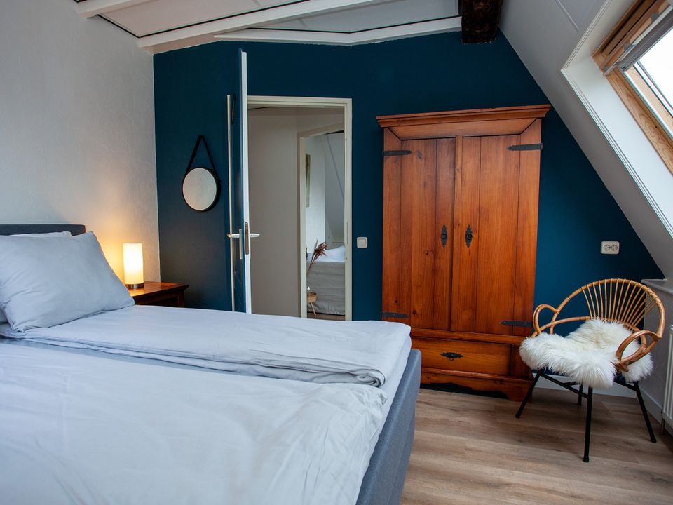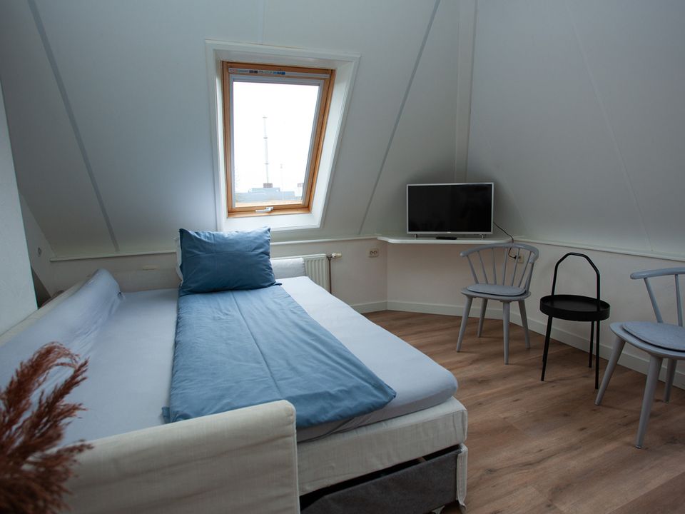 This large room - the Panorama Suite - is located on the second floor and has its own entrance. The room is suitable for a maximum of three people, in the extra room there is a (sleeping) couch where a third person can sleep. The room also has two comfortable single box-spring beds and a private bathroom with a shower, toilet, sink and various toiletries. The suite has a comfortable sitting area with a reading lamp and you have the option to make a cup of coffee or tea.