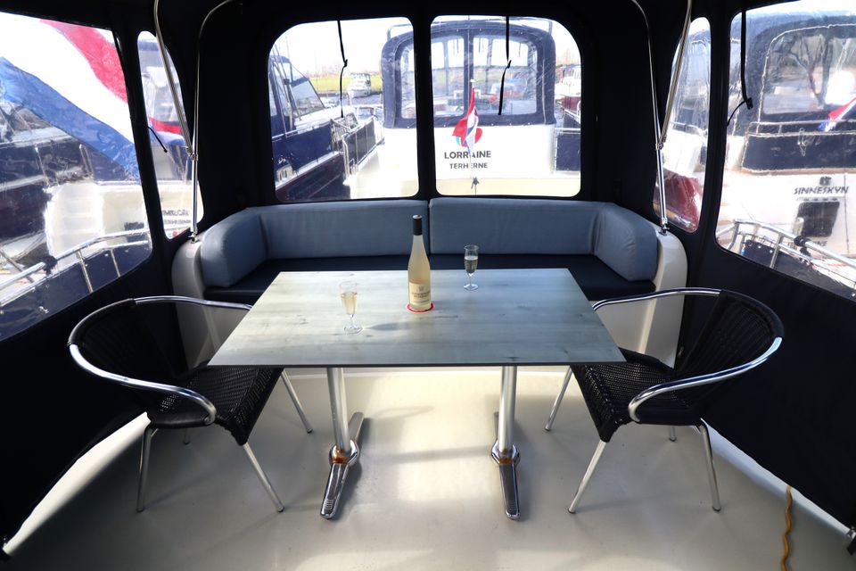 On the large aft deck you can enjoy a fixed bench, an XL convertible tent, steering position and solar panel. Via the integrated spiral staircase you can easily walk to the swimming platform, where you can easily get on and off the boat. Here you will also find an outdoor shower for after swimming.