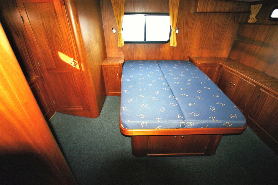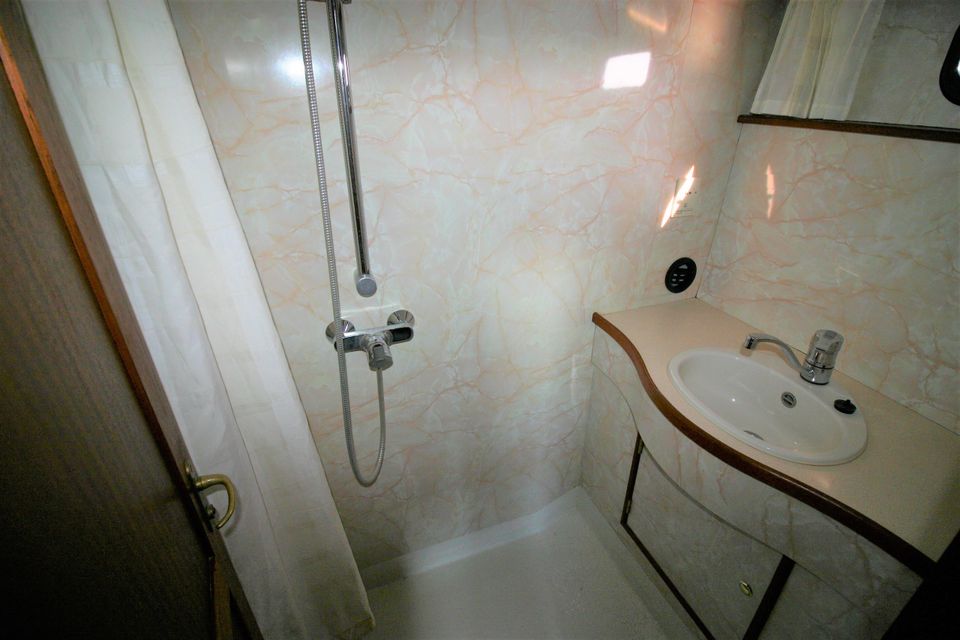 Layout: In the front you will find a spacious bedroom with a double French bed, and to starboard a second cabin with a double bed. These cabins share a bathroom with electric toilet, shower and sink. The salon is spacious and tastefully furnished with an L-shaped seating area. The fully equipped kitchen has a complete inventory for 8 people, and the dinette can be converted into an extra double berth. In the aft cabin there is a spacious bedroom with a double French bed, a dressing table, a second electric toilet and a separate bathroom with shower and sink.