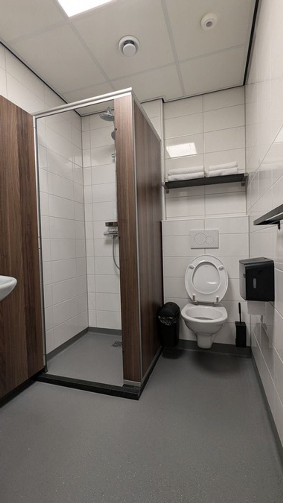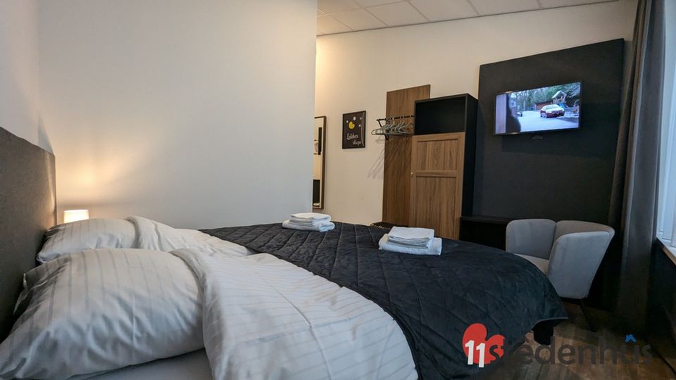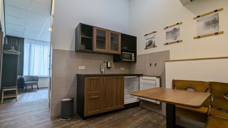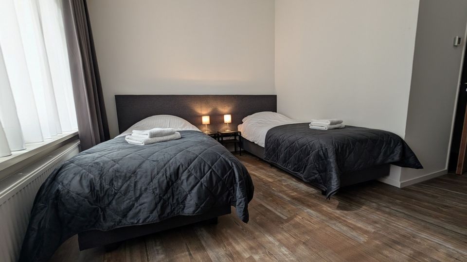 The sleeping area is furnished with two comfortable king-size hotel beds, ample closet space, hangers, and an armchair. The 42-inch digital television offers a standard channel package, and you can easily connect your own laptop, phone, or tablet via the HDMI-USB-C port. The room has a spacious, lockable bathroom with a vacant/occupied lock, equipped with a shower and toilet. A mirrored cabinet stocked with toiletries and a hairdryer is provided. The shower enclosure features a comfortable rain shower for a relaxing start to the day. Finally, each room has a kitchenette with a refrigerator, storage space, a sink, and a combination microwave. The round seating area can be used as a workspace or for enjoying a simple meal.