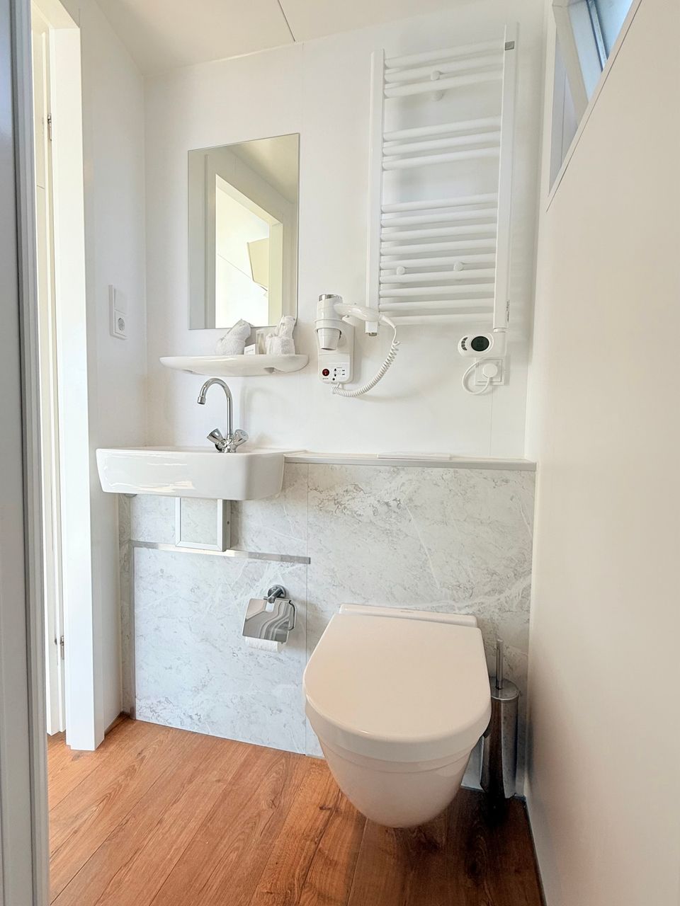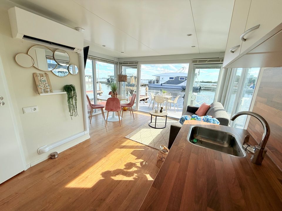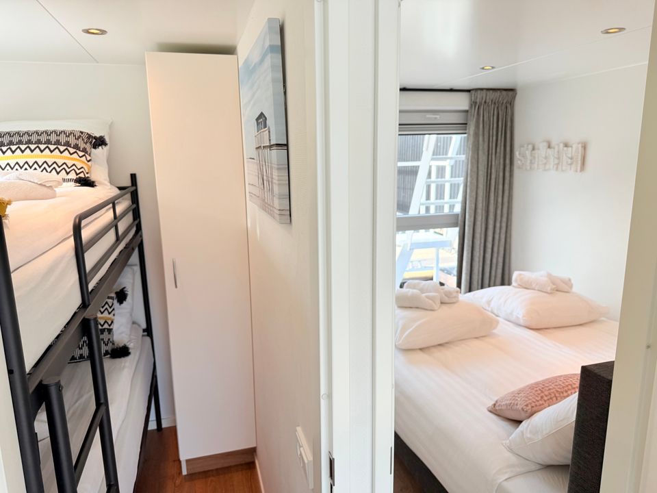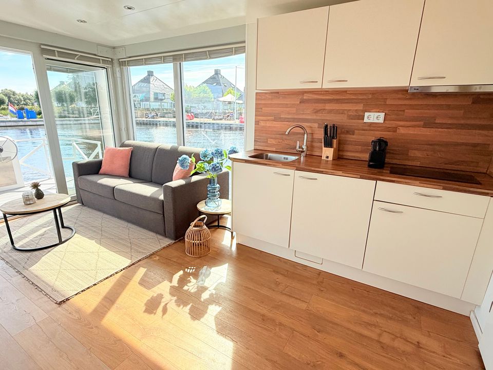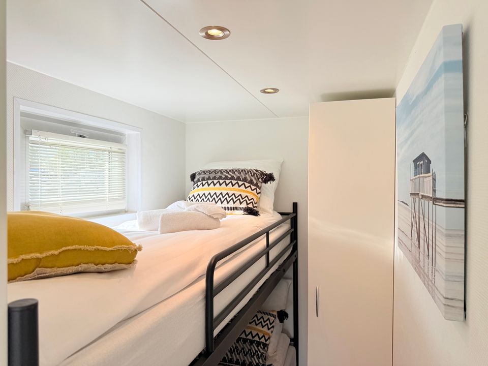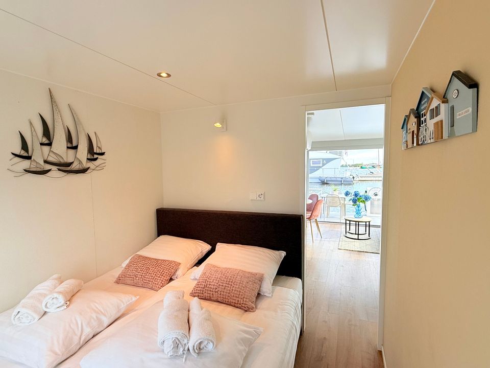 This Boathouse is practically and comfortably furnished. It's a compact hotel room boat with good air conditioning. Inside, you'll find an open-plan living area with a Smart TV and a sitting area with a kitchenette. There's a separate sleeping area with a spacious double bed and an additional room with a bunk bed. The bathroom has a shower and toilet. Outside, you have a private terrace on both the foredeck and the roof terrace, offering wonderful views of the boat harbor and the Sneekermeer lake. Surprising and vibrant!