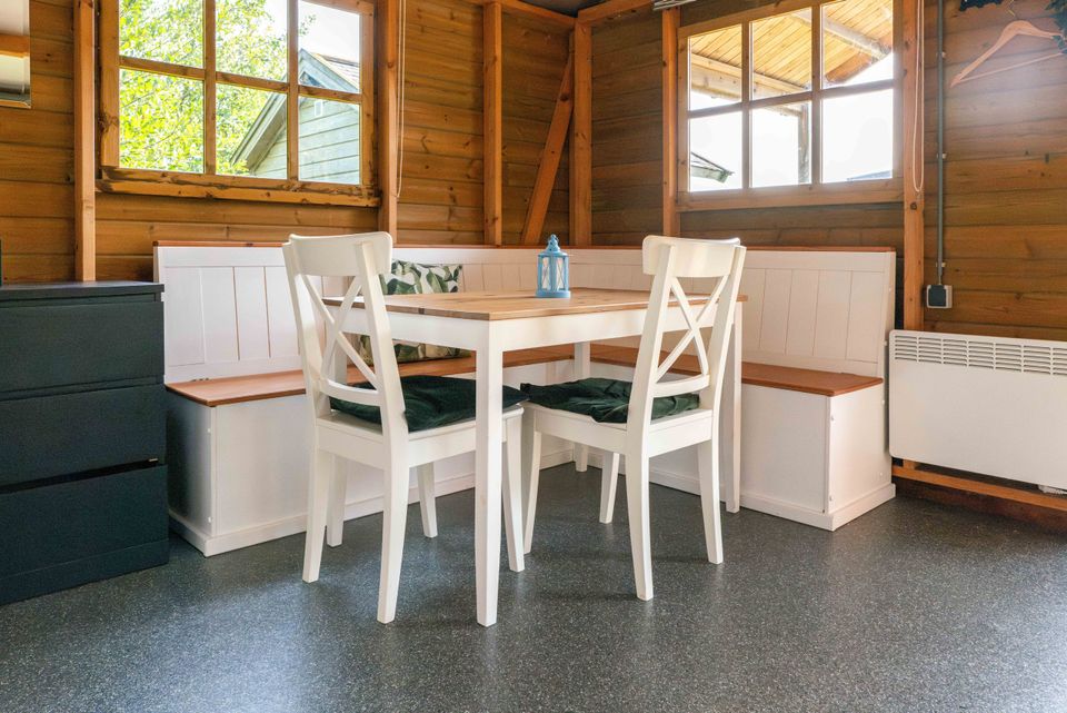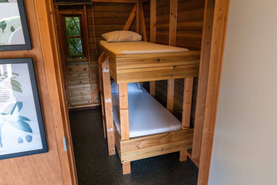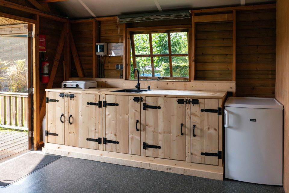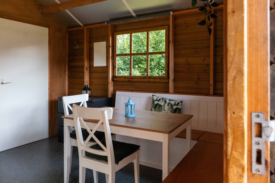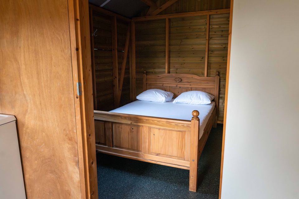 On the grounds of De Rakken, near the reception and restrooms, are two hiker's cabins. These cabins contain two bedrooms, one with a double bed and one with a bunk bed. The living area includes a corner sofa with a table and chairs, a kitchenette with utensils for four people, and an electric heater.