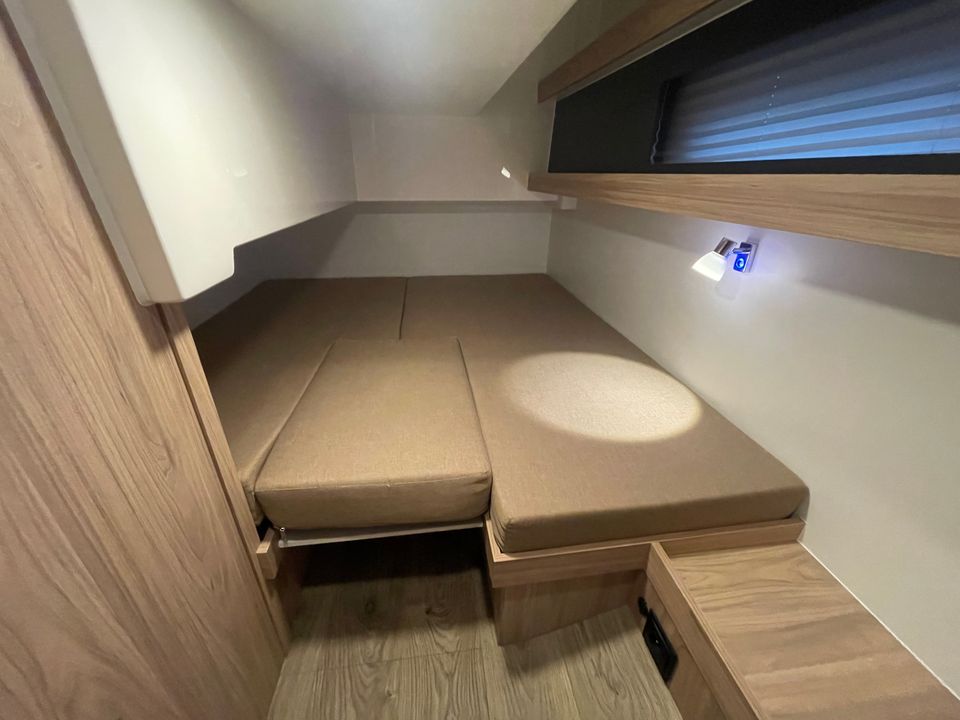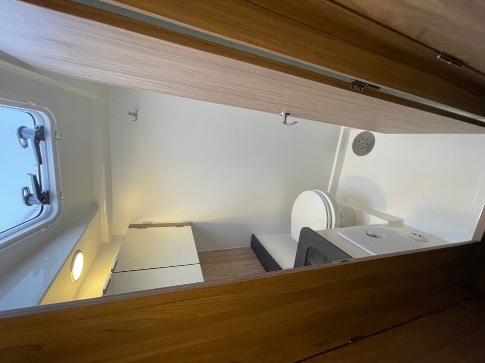 Inside, you'll find three cabins with six fixed berths, a spacious saloon, and a practically equipped galley. There are three electric toilets, a hot shower, and heating for added comfort on board. 12V and 230V electricity via shore power and an inverter completes your stay. Outside, you'll find a swimming platform and comfortable seating. Bow and stern thrusters make maneuvering in the harbor easy.