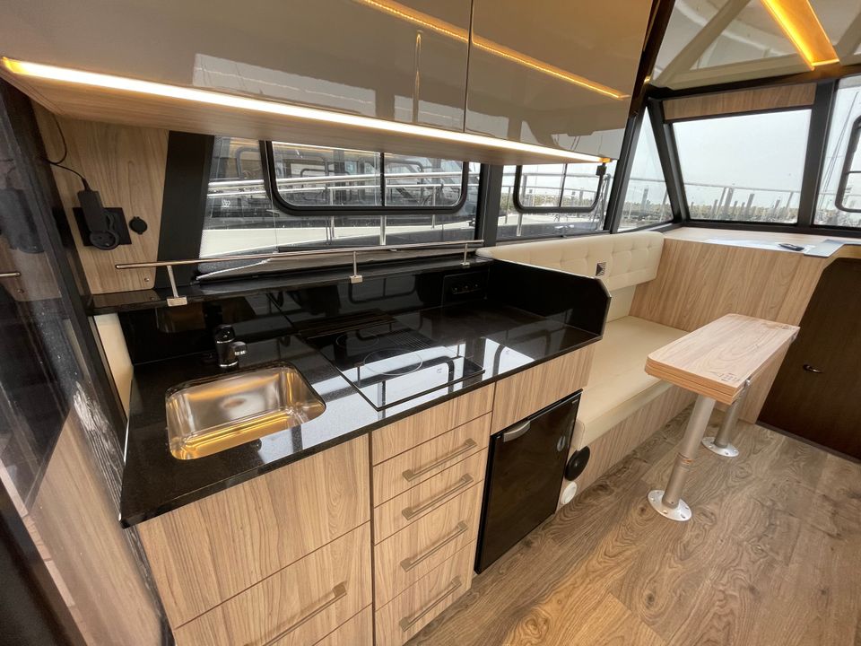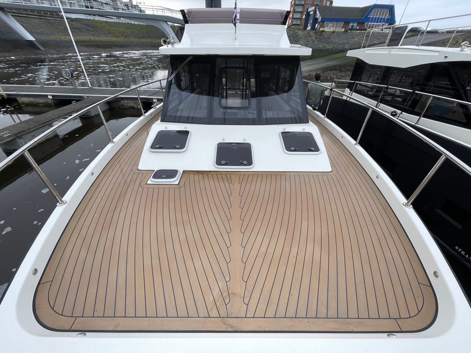 Sturdy and compact motor yacht with flybridge, suitable for the Frisian lakes