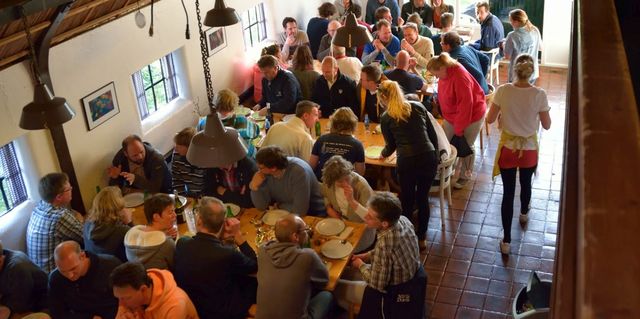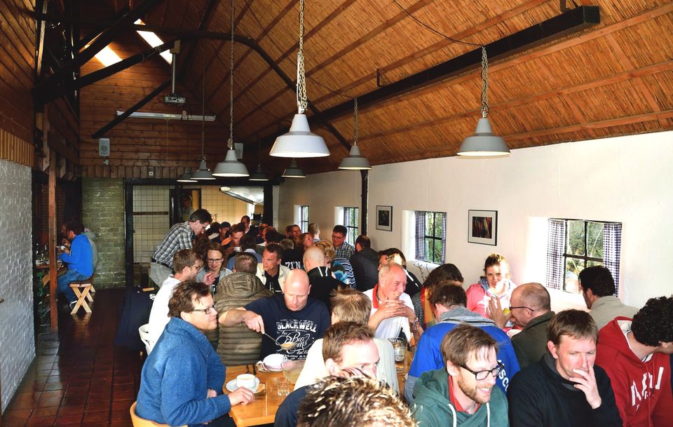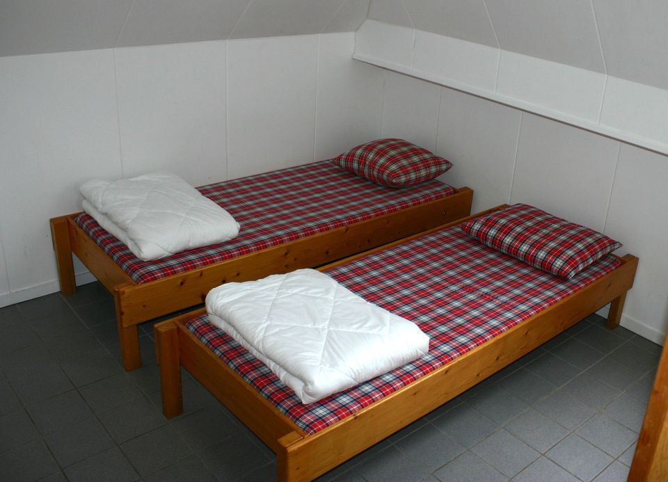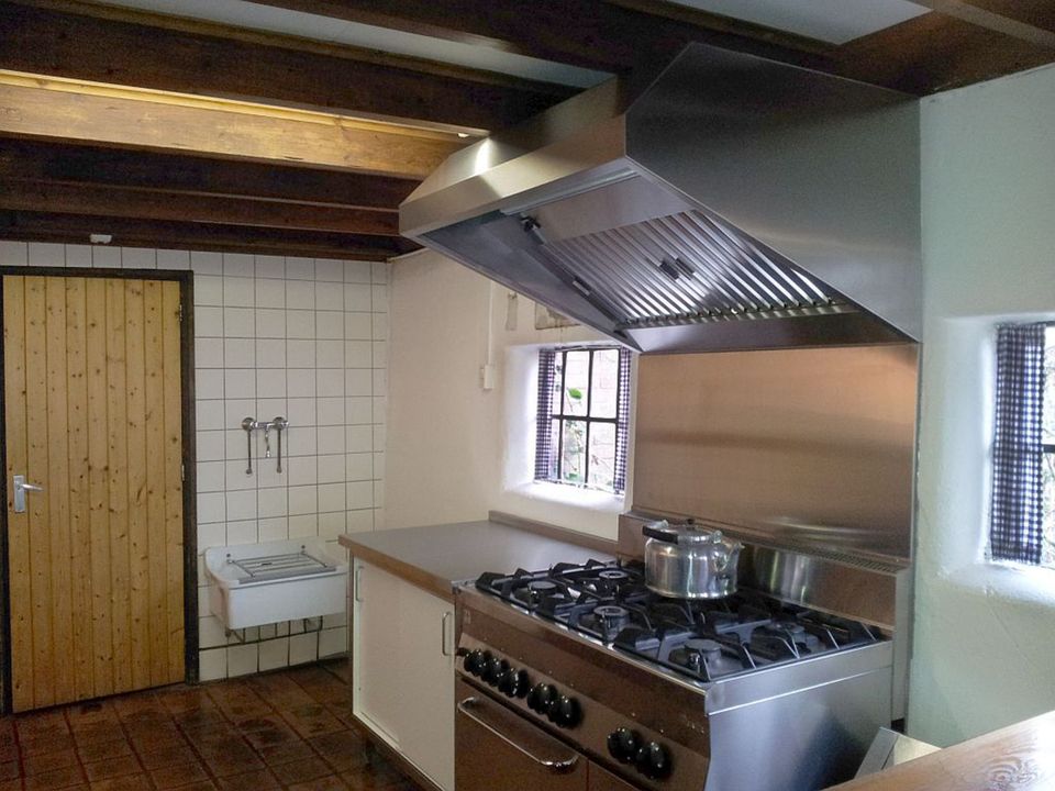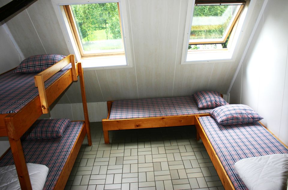 The open-plan kitchen is fully equipped and includes a six-burner stove with oven, a professional dishwasher, microwave, and coffee maker. There is also a separate storage room with two refrigerators and a freezer. Outside, there is a terrace overlooking the playing field behind the farm. On the first floor are two double bedrooms, two six-person rooms, and one five-person room. There are also several showers and toilets. A hallway also provides access to a four-person room and a double room, each with a shower and toilet. There is also a five-person room with its own shower and toilet. On the second floor is a five-person room with its own shower and toilet.