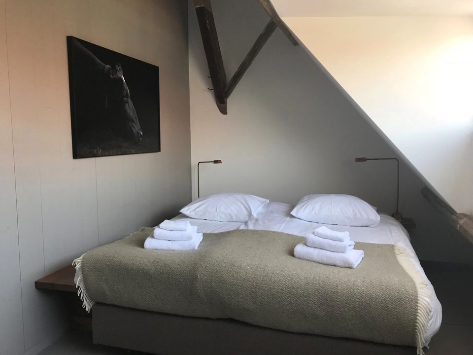 The house has six bedrooms and five bathrooms, accommodating up to 16 people. On the first floor, there are five double bedrooms, each with its own bathroom with a shower and toilet; one of these rooms also has a bathtub. Two rooms can be expanded with an extra bed, ideal for families or groups of friends. On the ground floor, there's a bedroom with three single beds and its own sink, with toilets nearby. All rooms are stylishly decorated and exude the same warm atmosphere as the rest of the house – with comfortable beds, soothing colours and plenty of natural light.