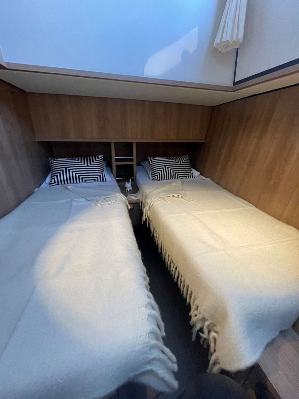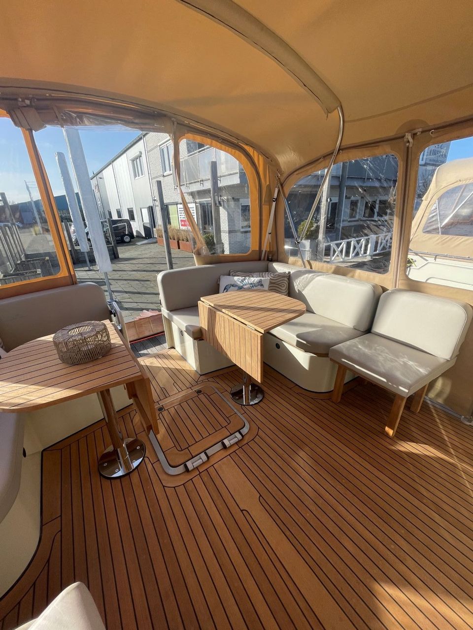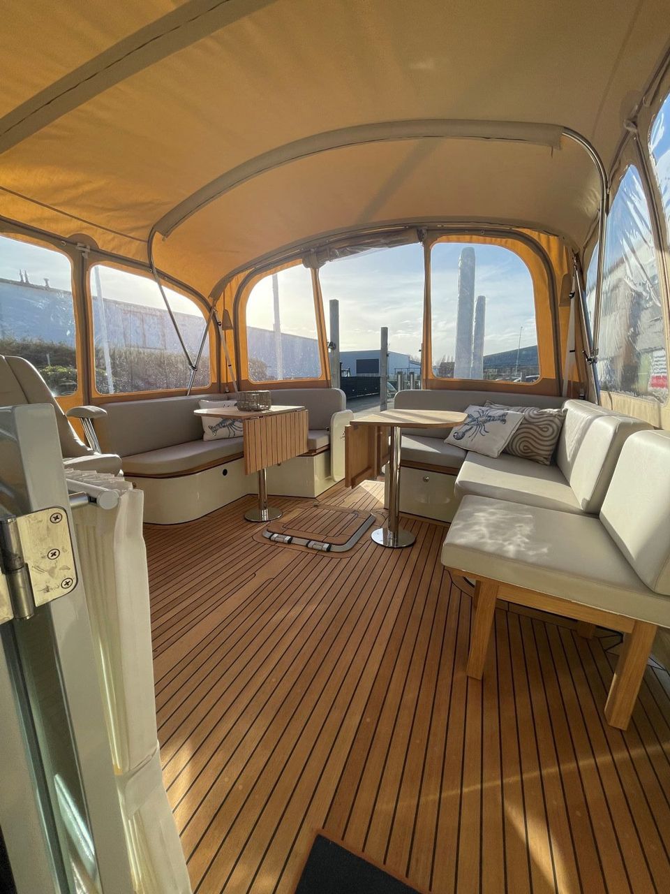 This motor yacht has three sleeping cabins and is therefore suitable for up to six people! Two of the sleeping cabins have a double bed and the third sleeping cabin has two single beds. There are also two bathrooms and two toilets on board, and there is plenty of cupboard space. The interior is light and uses luxurious materials. The kitchen is located next to the dining area and there is a lot of light. There is also a comfortable sitting area with television and Apple TV. On the aft deck there is a spacious fixed sofa with comfortable cushions, the aft deck can also be opened or closed using the convertible tent. All yachts are equipped with both bow and stern thrusters.