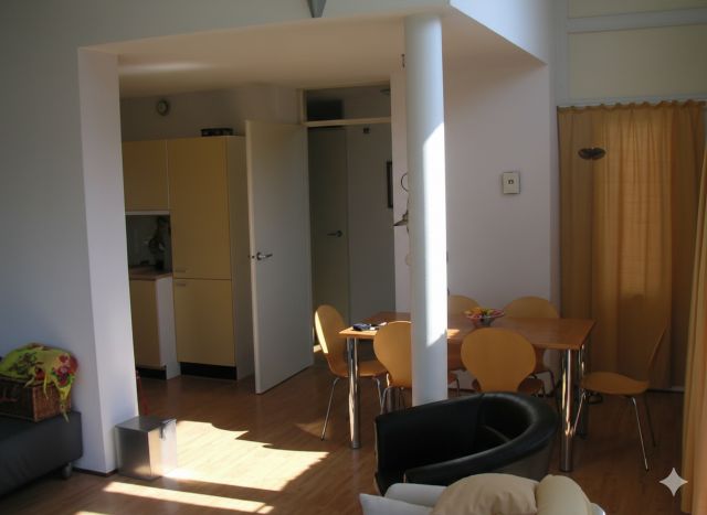 This spacious tower house for six people has three bedrooms, two with double beds and one with a bunk bed. A cot is also available. The house has two bathrooms: one with bath, shower and toilet on the first floor and a second bathroom with shower and toilet on the second floor for extra privacy. A separate toilet is located on the ground floor.