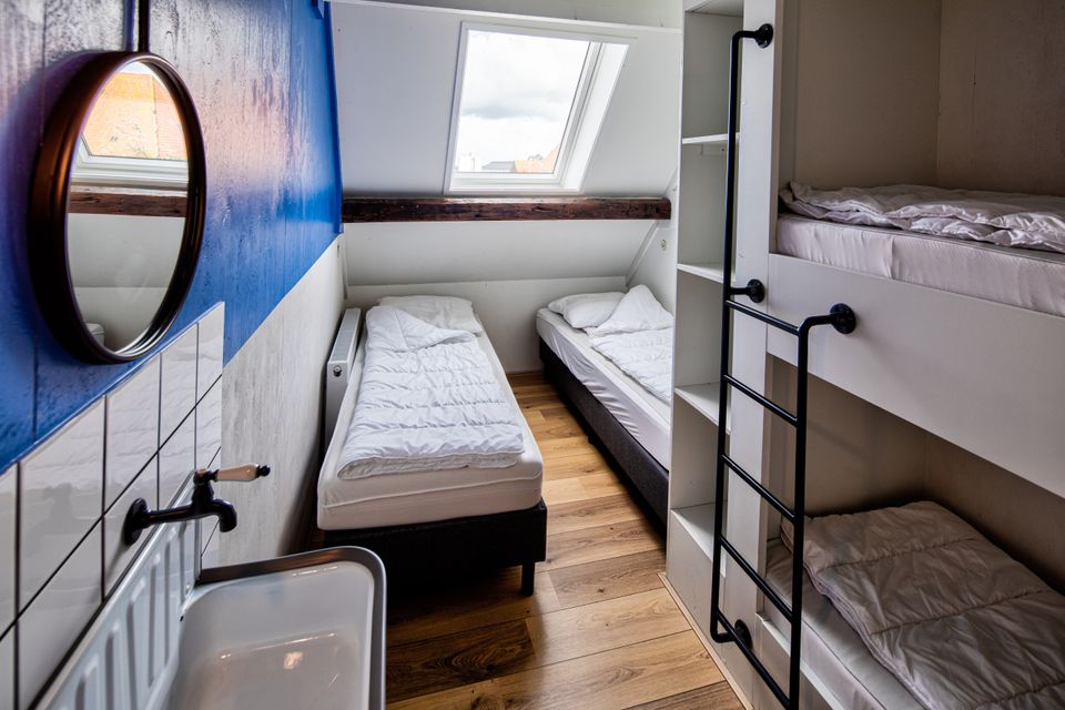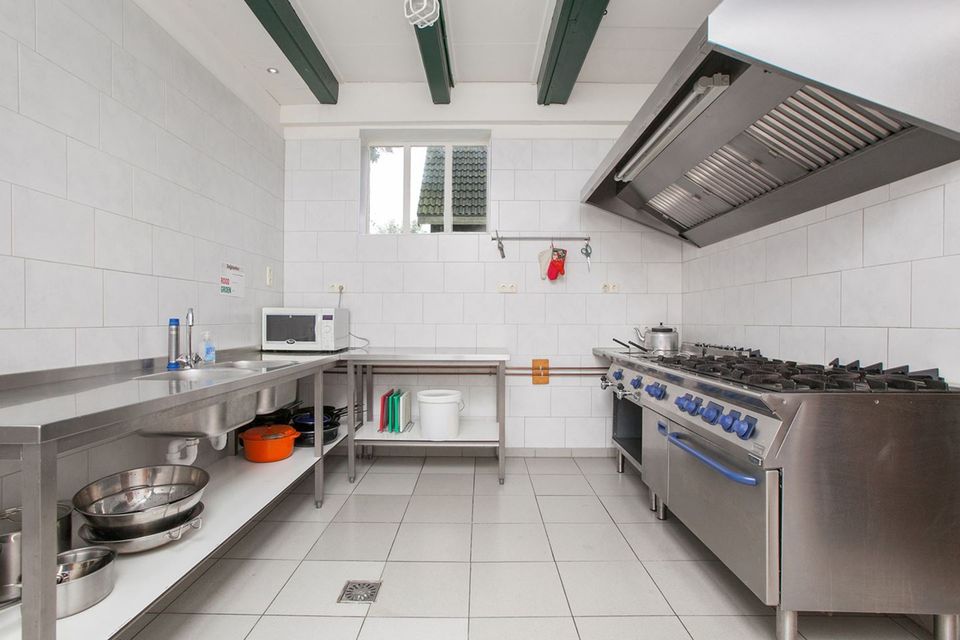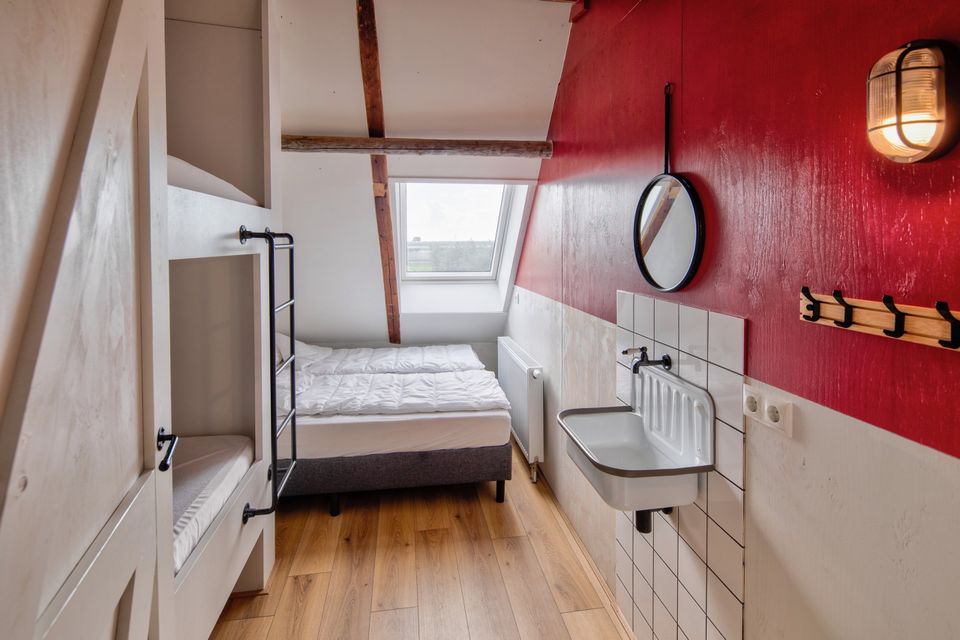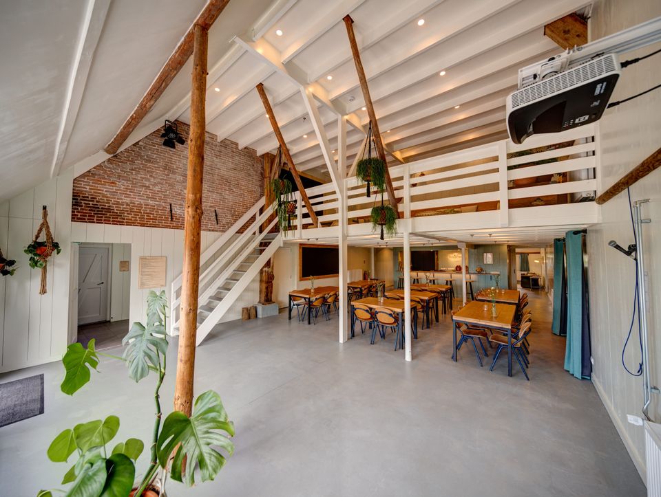 This detached accommodation is situated directly on the water and was fully modernized in 2019. Its unique combination of character and comfort makes it the perfect venue for groups of 30 to 100 people. Inside, you'll find a spacious and bright communal area with chairs and tables for 50 people. This can easily be expanded to seat 75. For larger groups, additional tables and chairs can be placed on the mezzanine, providing seating for up to 100 people. The space features a cozy, fully equipped bar, French doors leading outside, and audiovisual equipment for presentations or atmospheric evenings. Behind the bar is a separate lounge with views of the grounds and a foosball table. For larger groups, this space serves as an additional dining area. The professional kitchen is fully equipped, including a laundry area, 6-burner gas stove, refrigerators and freezers, a large oven, microwave, and a fully equipped kitchen. On the first floor, there's a charming mezzanine with a flexible lounge layout and a view of the communal area. There are multiple bedrooms with unique box beds and ample sanitary facilities, ensuring everyone can sleep comfortably. Outside, there's plenty of space to relax and play. The grounds include a recreational field with a volleyball net, a fire pit, a large parking lot, and a cozy covered terrace. During your stay, you can choose to have everything taken care of. We're happy to take care of the catering and can create a complete program. In short: the ideal location for weekend getaways with family and friends, company outings, meetings, weddings, and school or sailing camps.