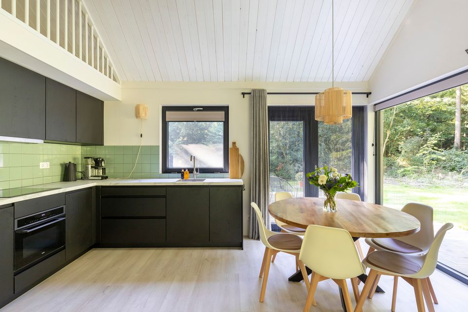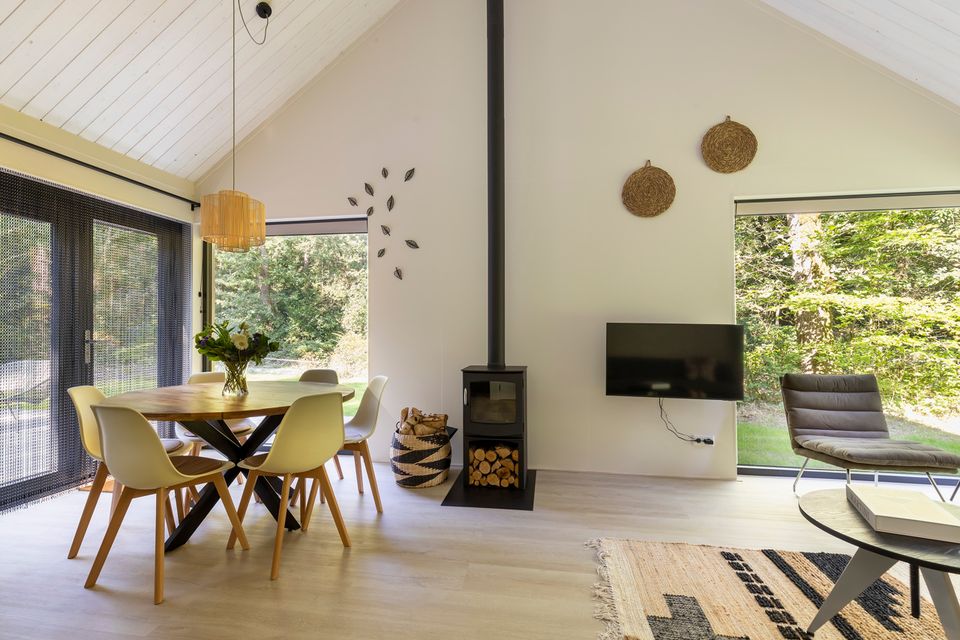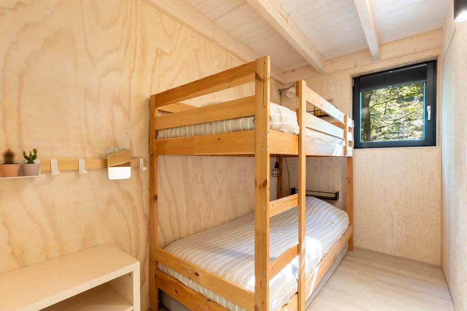 Boshuis Bambi is a new nature house (built in 2024) located in the middle of the forests of Gaasterland. The house offers a spacious living room with an open kitchen and a cozy wood stove. Large patio doors lead to a terrace with a view of nature. There are three bedrooms: two on the ground floor (one with a double bed and patio doors, and one with a bunk bed) and a spacious bedroom on the first floor with two single beds. The bathroom has a rain shower, and there is a separate toilet.