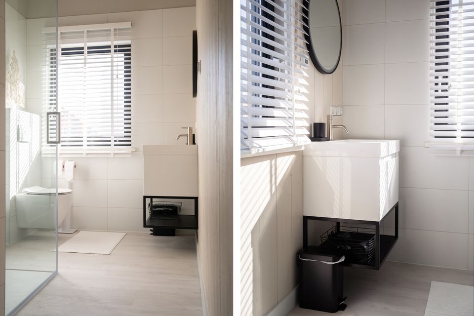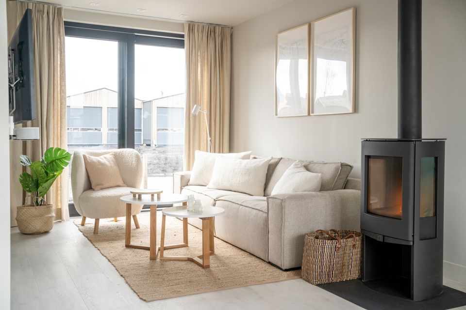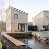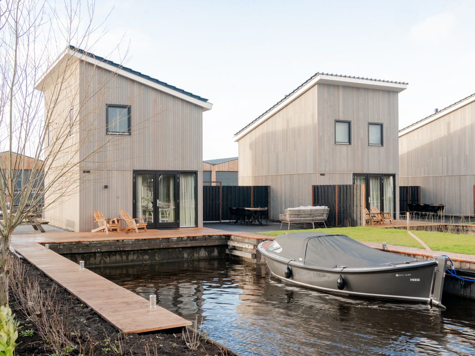 These beautiful, new homes are spacious with a large living room containing the living and dining room and the kitchen. The open kitchen is luxurious and fully equipped, including an induction stove, dishwasher and combination microwave. The light furnishings and many windows make it a pleasant stay in the cozy living room and in winter you can easily light the wood stove for warmth and extra cosiness. On the first floor of the house are two double bedrooms, each with comfortable box-spring beds. Each bedroom has its own bathroom with toilet, shower and sink, as well as ample closet space. There is an additional separate toilet on the ground floor of the holiday home. The spacious garden includes a terrace with garden table and chairs and a lounge sofa and a beautiful view of the waterway.