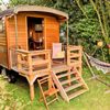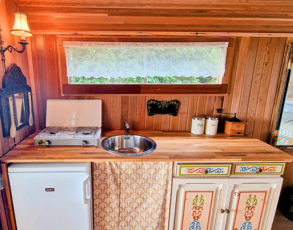 This cozy gypsy wagon is located directly on the Franekervaart and offers a unique view over the water and the surrounding meadows. You sleep in a cozy box bed and cook in the simple but complete kitchen. The veranda and private terrace are ideal for enjoying the sunset. For cold days there is a gas heater. The sanitary building offers free showers, toilets and a washing-up area with hot water.