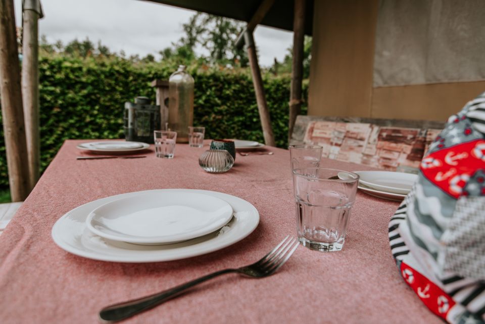 'The Titanic' is a beautiful large safari tent suitable for up to 7 people. The tent is decorated in cheerful blue atmospheres and equipped with every convenience. There is a double bed, a bunk bed, three single beds, a rain shower, separate toilet and fully equipped kitchen. If the evening is cold, there is also a nice gas heater that can be turned on. There is also a beautiful veranda in front of the safari tent where you can sit in relaxing chairs. This is the ultimate destination for a larger group.