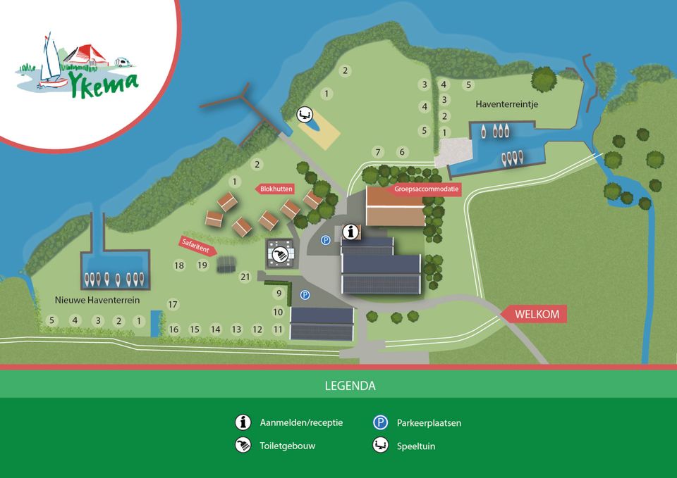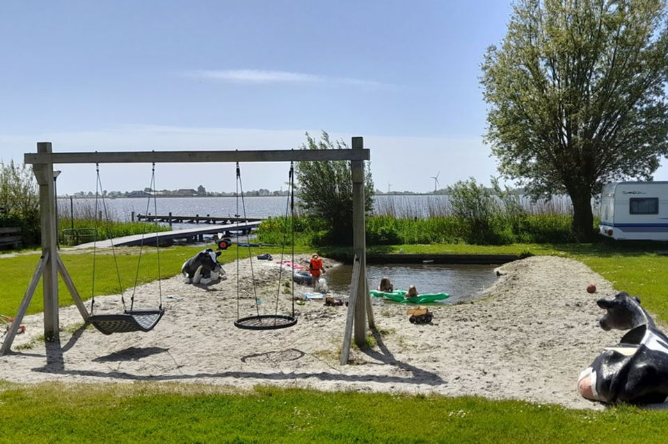 The campsite is located on the water in the beautiful lake area of Southwest Friesland and has many facilities. In addition to the possibility to reserve a place for your tent, caravan or motorhome, it is also an option to choose the group accommodation, the log cabins or glamping tent. The group accommodation is suitable for groups up to forty people, but can also be booked for smaller groups. The log cabins and glamping tent are suitable for a group of up to five people. There is also a nice spacious toilet block with toilets, 6 showers, a launderette and a baby room. The 6 showers are equipped with automatic showers and work on € 0.50 cent coins. A disabled room is available for our guests who have difficulty walking. There is an opportunity to do your dishes on the side of the toilet block.