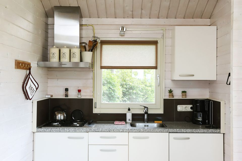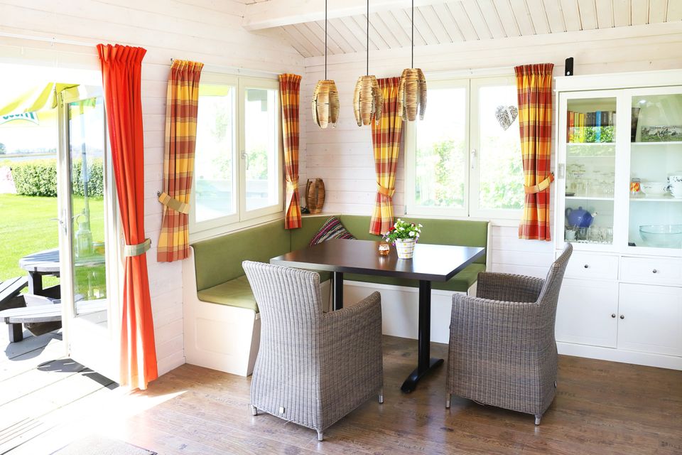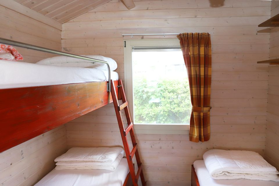 The log cabins have two bedrooms. One of these has a double bed and one room has three single beds. All beds have duvets and pillows. Both cottages have a fully equipped kitchenette with a stove and fridge, a sitting area, TV and a toilet. To take a shower you walk to the toilet block. Outside there is a terrace, with a picnic table and parasol where you can also enjoy! You can bring your own linen or rent it.