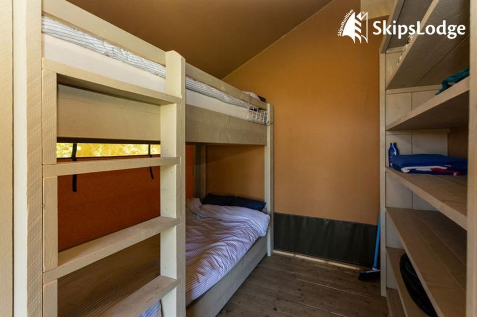 The charm of a tent, the comfort of a cottage. The SkipsLodge tent cottage is located on the harbor grounds of Marina Stavoren, just a stone's throw from the restrooms with dishwashing facilities, the heated swimming pool, and our cozy lounge with a climbing frame for the little ones and a billiards and foosball table for older children. There's also a flat-screen TV for cozy watching. The SkipsLodge sleeps up to four people and features a double bed and a bunk bed. There's a dining table/seating area, a kitchen sink with a kettle and refrigerator, and an electrical hookup. There are no stoves or water connections. Enjoy the marina's activities on the veranda, which features a lounge sofa and a seating area with a table and four chairs.