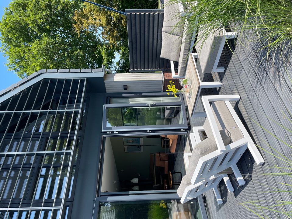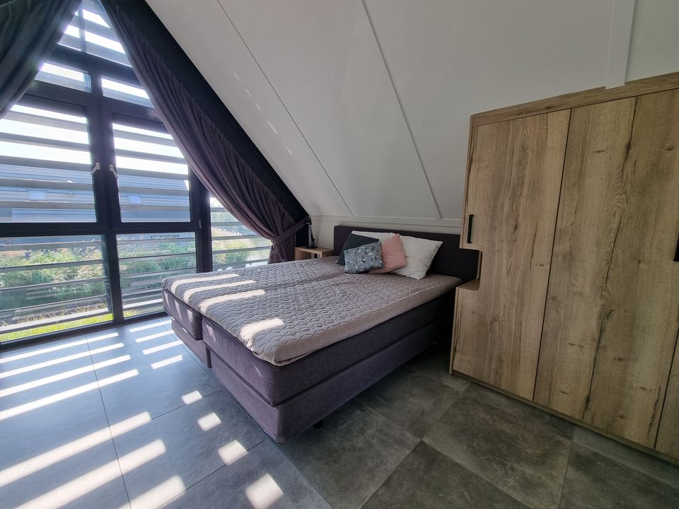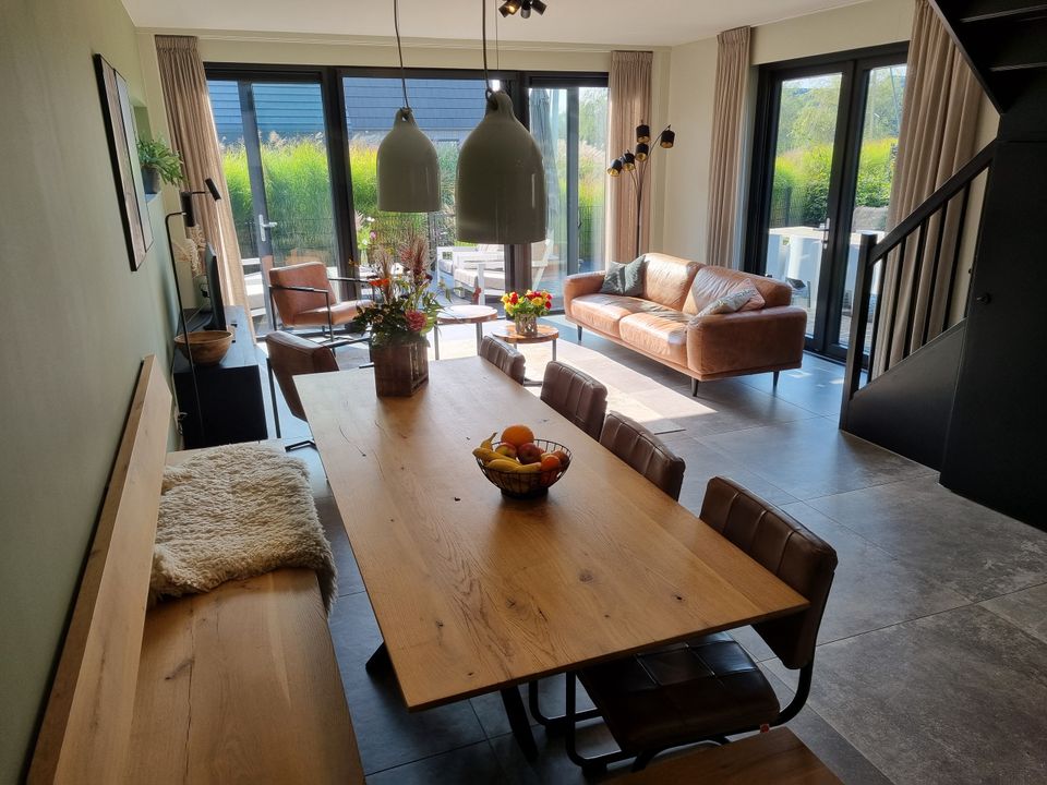 Watervilla Tweeintich is cozy yet coolly furnished, in the spacious living room everything revolves around the beautiful view over the water. When you walk through the patio doors onto the terrace, you can also see the jetty where you can moor a boat. There is a nice garden around the house. The kitchen is fully equipped with a dishwasher, Nespresso, Quooker and multifunctional oven, so you only have to think about what you are going to cook. You will also find the first bedroom on the ground floor, with its own bathroom! The other three bedrooms are on the first floor, as well as two more bedrooms and a separate toilet. One of the bedrooms is a real children's room, with a bunk bed. The other two bedrooms both have two single box-spring beds. - Good to know, the garden is fenced.