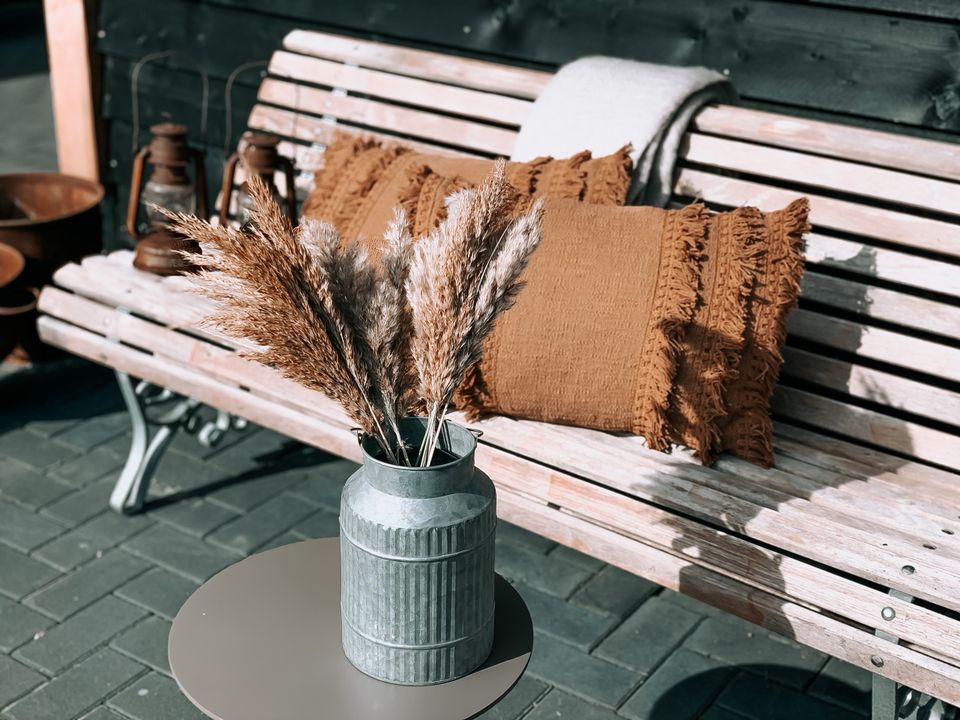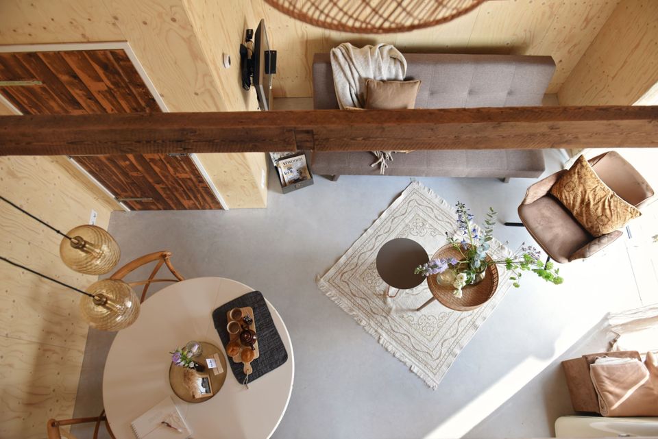 You can use the hot tub. There is an electric boat rental available and the children will have a lot of fun on the climbing frame. There are goats, chickens for fresh eggs and cows and horses in the meadow and you can buy fresh products in the on-site farm shop. In the farm barn you will find a cozy living room. Who would have thought that hay bales could be so stylish? The soft light bulbs hang playfully throughout the room. The farmhouse tables are perfect for an evening of gourmet dining or a game of Rummikub. The living room is a place where you can be together, but also where you can retreat and enjoy the peace that the old building radiates. Sometimes they drink a cup of coffee and children play in the children's kitchen. At other times it is quiet and you can relax in one of the vintage chairs for a lazy afternoon.