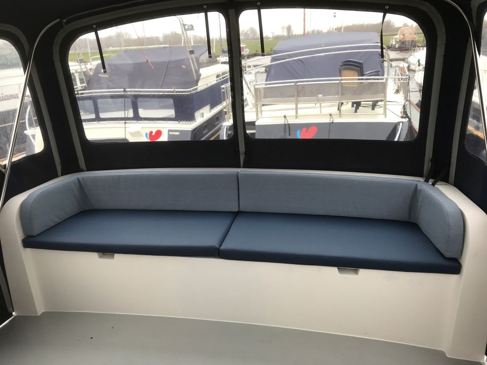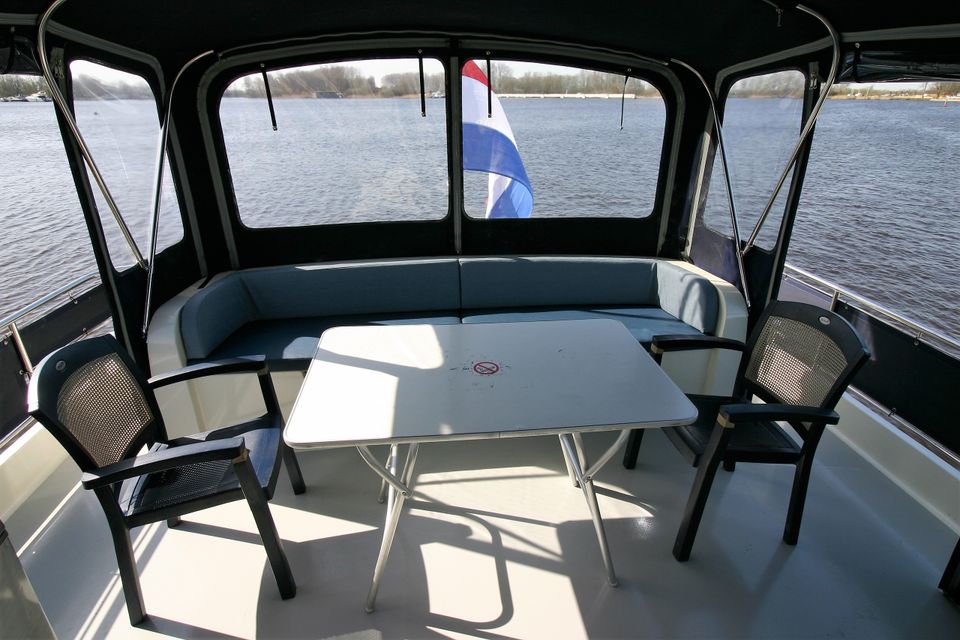 The spacious sun deck is equipped with a steering position, solar panel, extra refrigerator, fixed bench, heated XL convertible tent, deck chairs and a table. Via the integrated spiral staircase you can easily walk to the swimming platform with swimming ladder - ideal for getting on and off the boat.
