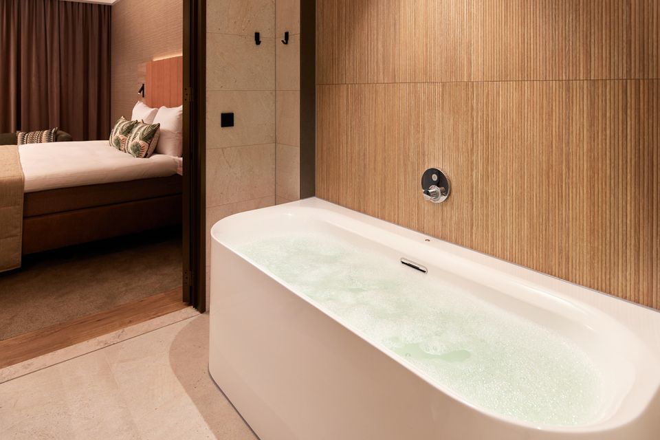 Deluxe rooms, overlooking the greenery, are a mix of timeless elegance, comfort and new technology. The modern furnishings with a desk and a comfortable sofa for 2 people are completed with an excellent double bed (equipped with a topper) that guarantees a good night's sleep. The rooms have a bathroom with a bubble bath, a separate rain shower and a toilet. The rooms offer modern extras such as air conditioning, telephone charging point integrated in the bedside table and wireless internet.