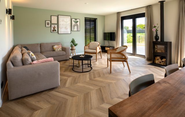 The villas have a spacious living room that overlooks the spacious garden, the water and the meadows. The furnishings are elegantly provided b…