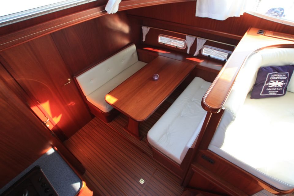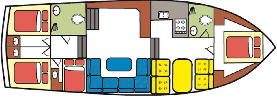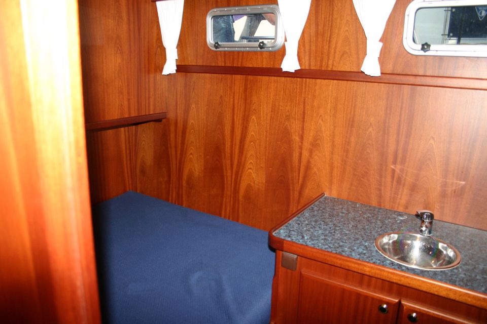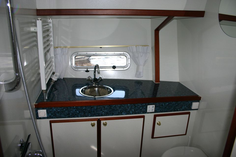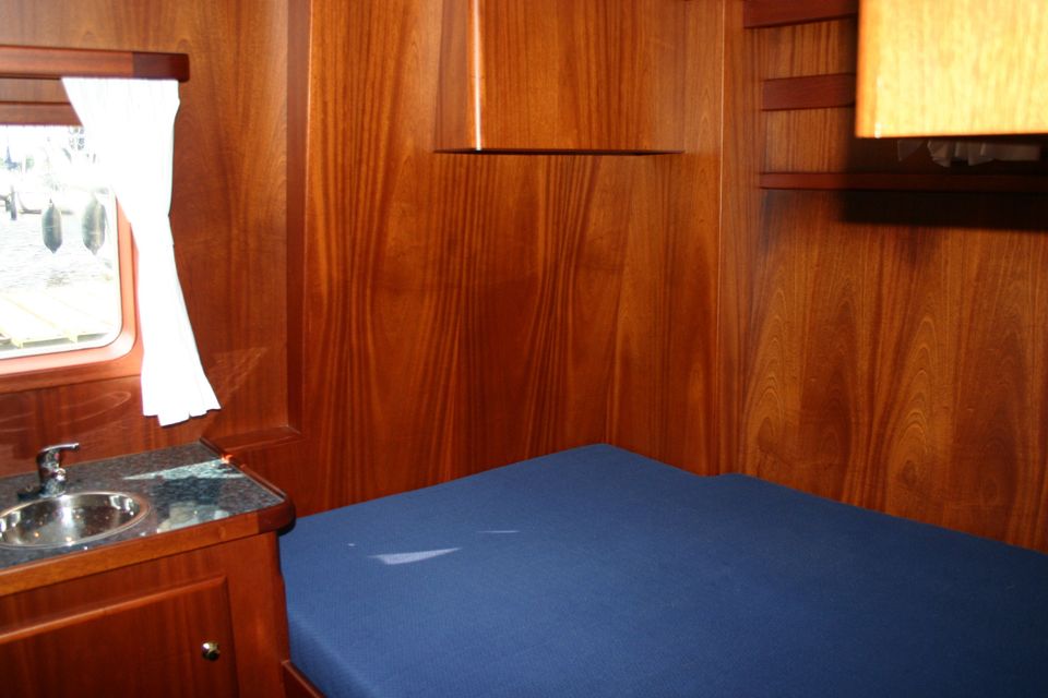 Layout: In the front there is a spacious cabin with a freestanding French bed and its own washbasin. In addition, there is a separate bathroom with shower, washbasin and electric toilet. The kitchen is fully equipped for 10 people and has a 4-burner gas hob, extractor hood, large refrigerator, combination microwave, dinette and plenty of storage space. The large saloon is cosily furnished with a comfortable U-shaped sofa, television and radio/CD player. Central heating ensures a pleasant stay, even in less good weather. In the back you will find three double cabins, each with its own washbasin and sufficient cupboard space. There is also a second bathroom with shower, washbasin and electric toilet.