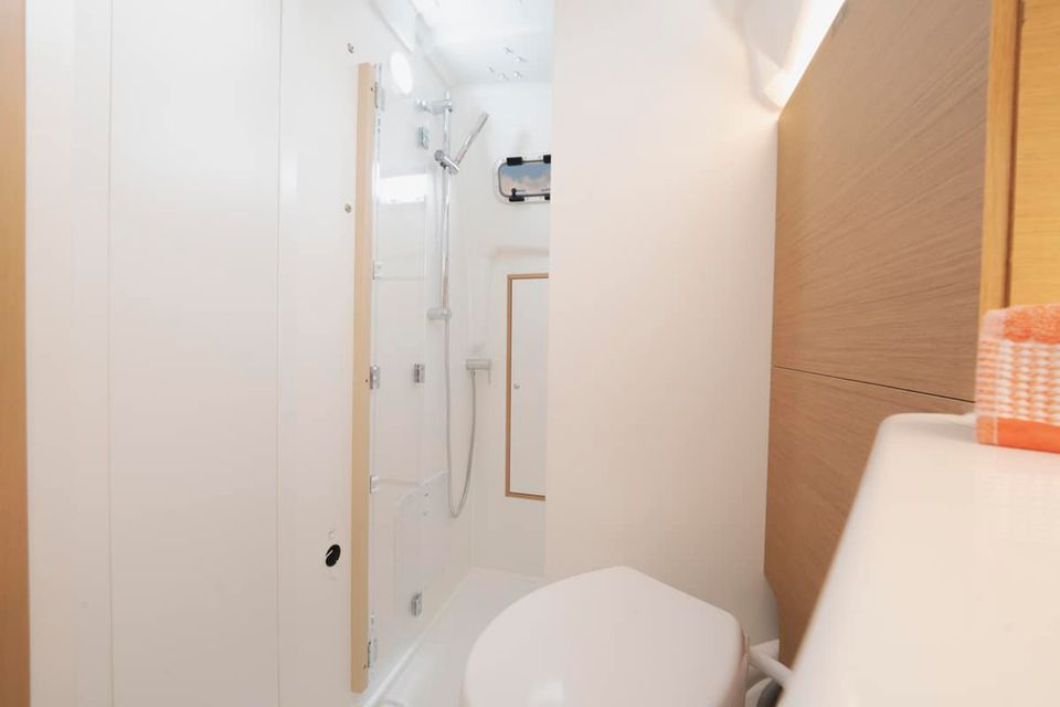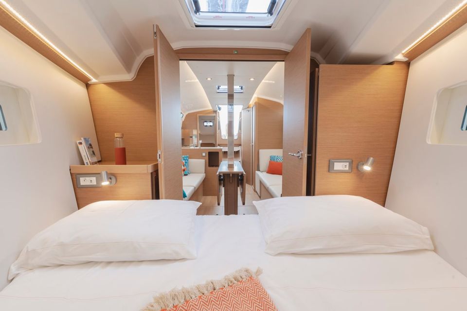 The Jeanneau Sun Odyssey 350 is available for charter from 2025. Thanks to its hydraulic lifting keel, you can sail on the Frisian lakes, as well as the IJsselmeer and the Wadden Sea. Inside, there are three cabins with six fixed berths, and the saloon can accommodate two additional berths. The galley is fully equipped, and there's an electric toilet with a shower and hot water. Heating and 12V and 230V electricity make for a comfortable stay. Outside, you'll enjoy a well-organized cockpit and dual steering wheels. All lines are controlled from the cockpit. The swimming platform is ideal for a swim stop. A bow thruster and electric windlass make mooring easy.
