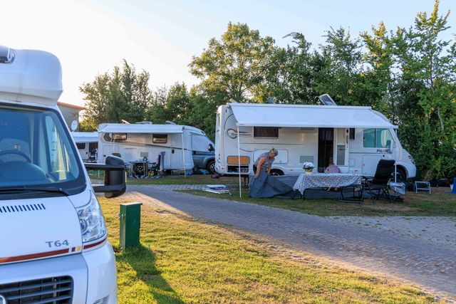 The camper pitches on field C are spacious with an average size of 80 m². The pitches are 10 metres long and 8 metres wide and have a paved surface with a green strip on the right side for extra comfort. Each camper pitch is equipped with 16 amps of electricity, a water and waste water connection and a digital TV connection.