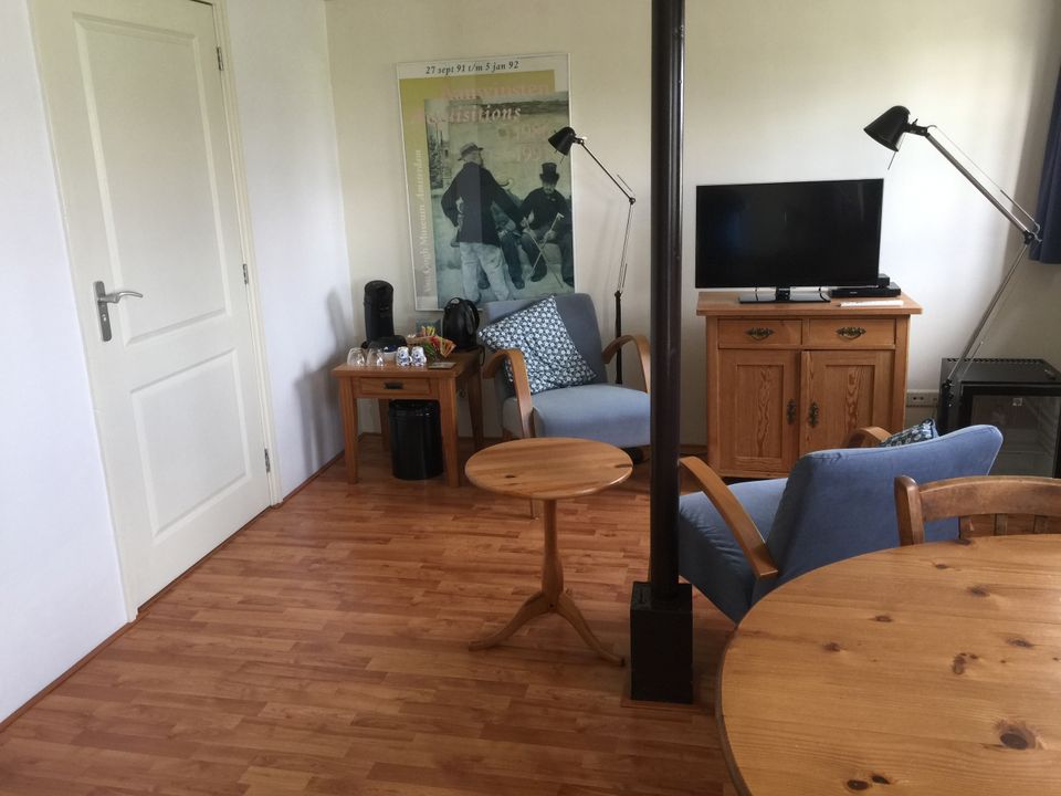 This luxurious double room is decorated with the painter Van Gogh as a theme. You can relax wonderfully on the spacious Auping twin bed, of which you can adjust both the head and foot ends. The room has a comfortable sitting area and table with chairs and there is also a flat-screen television. In your own private bathroom you will find a sink, shower and toilet. You do not need to bring towels, they will be ready for you upon arrival!