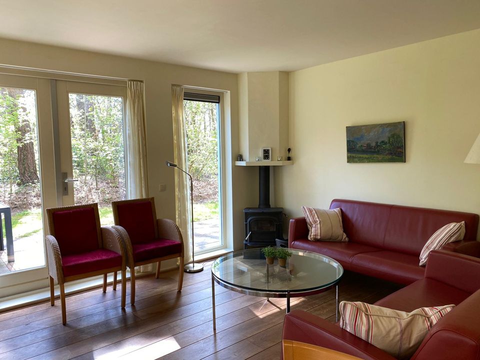 This holiday home, called 'de Leeuwerik', is a spacious eight-person house situated on a small-scale, private holiday park. If you are looking for peace, space and nature, this house is the perfect place for you! On the ground floor of the house you will find the first bedroom with patio doors to the outside. The bathroom is located on the ground floor, here is a shower, bath and sink. The toilet is separate from the bathroom. In the large, open space is the living, dining and cooking area, so you are always in contact with your company and you are not isolated from each other. Everything is spacious with enough seating for up to 8 people! On the first floor there are three bedrooms, two of which have two single beds and the third bedroom has a double bed. In addition, each bedroom has its own sink and there is a second toilet on the first floor. In the storage room of the house there is a washing machine and dryer, as well as an ironing board and iron, so you can always do laundry if necessary. The house offers parking for three cars and is surrounded by a large garden with a terrace where you can enjoy the sun.