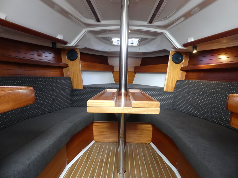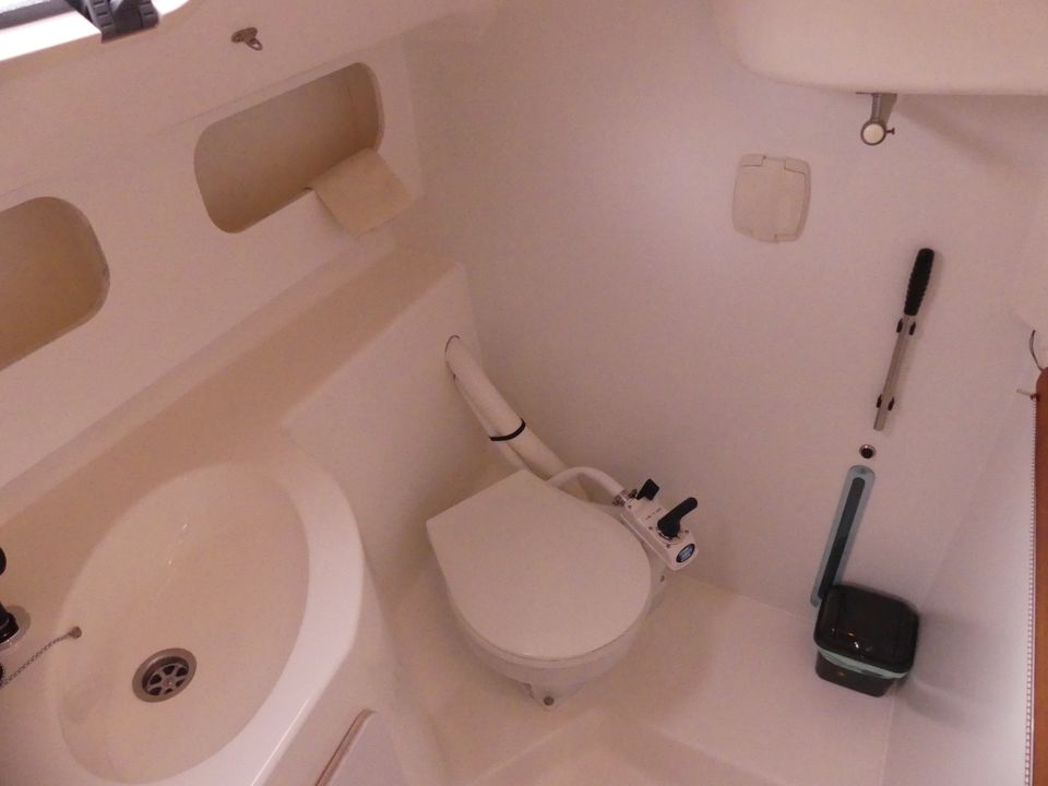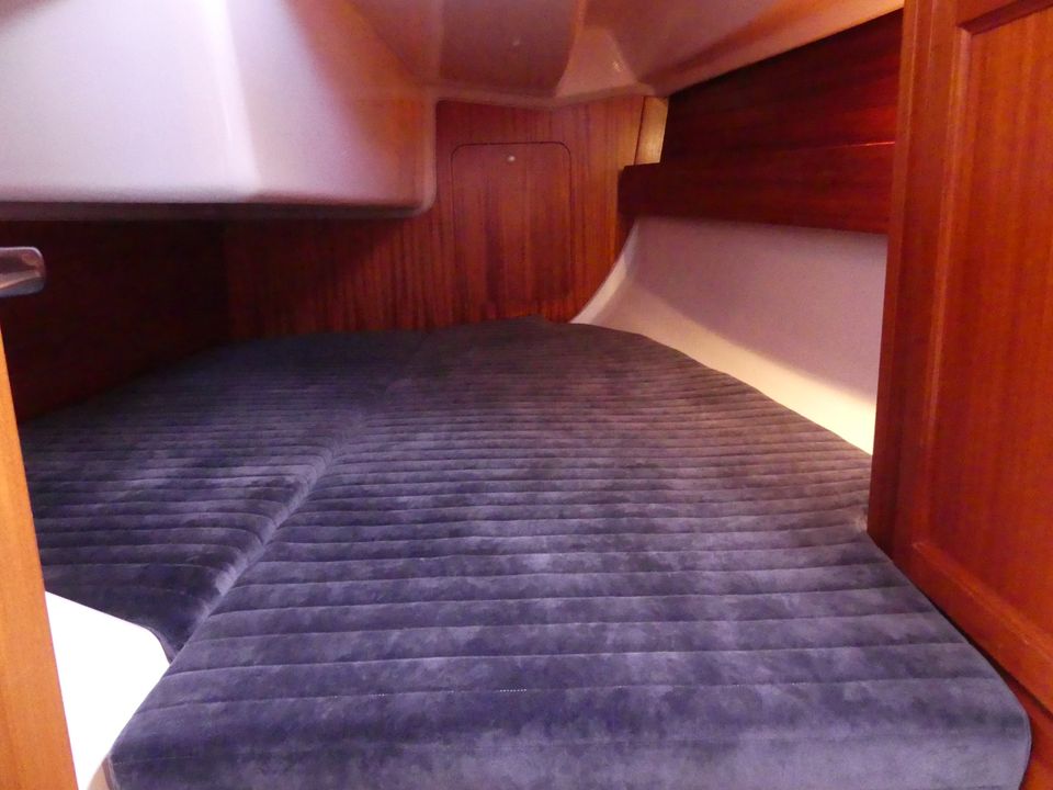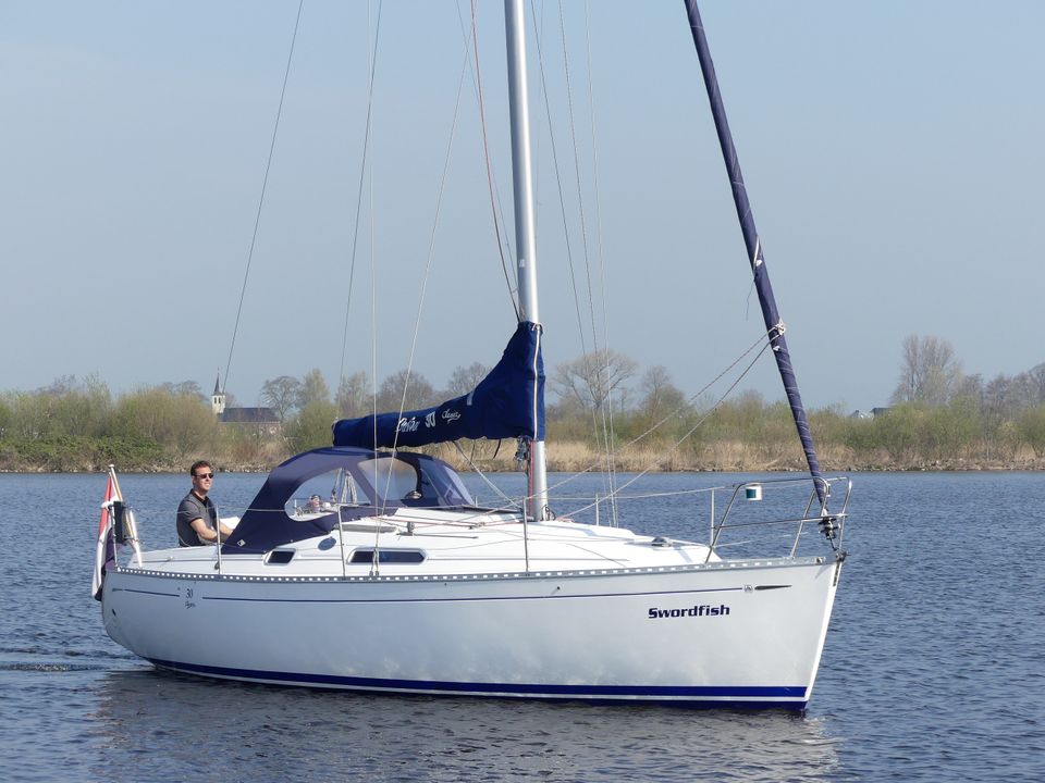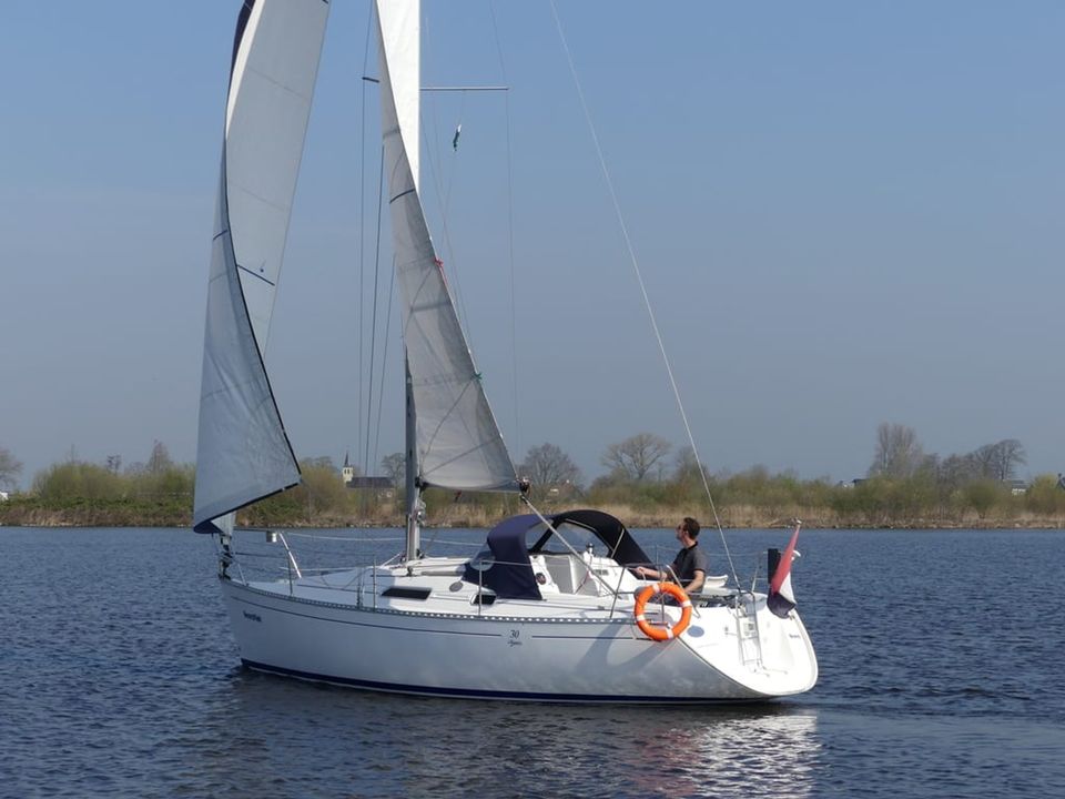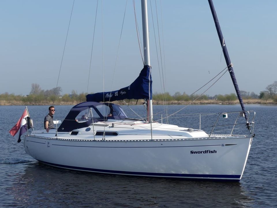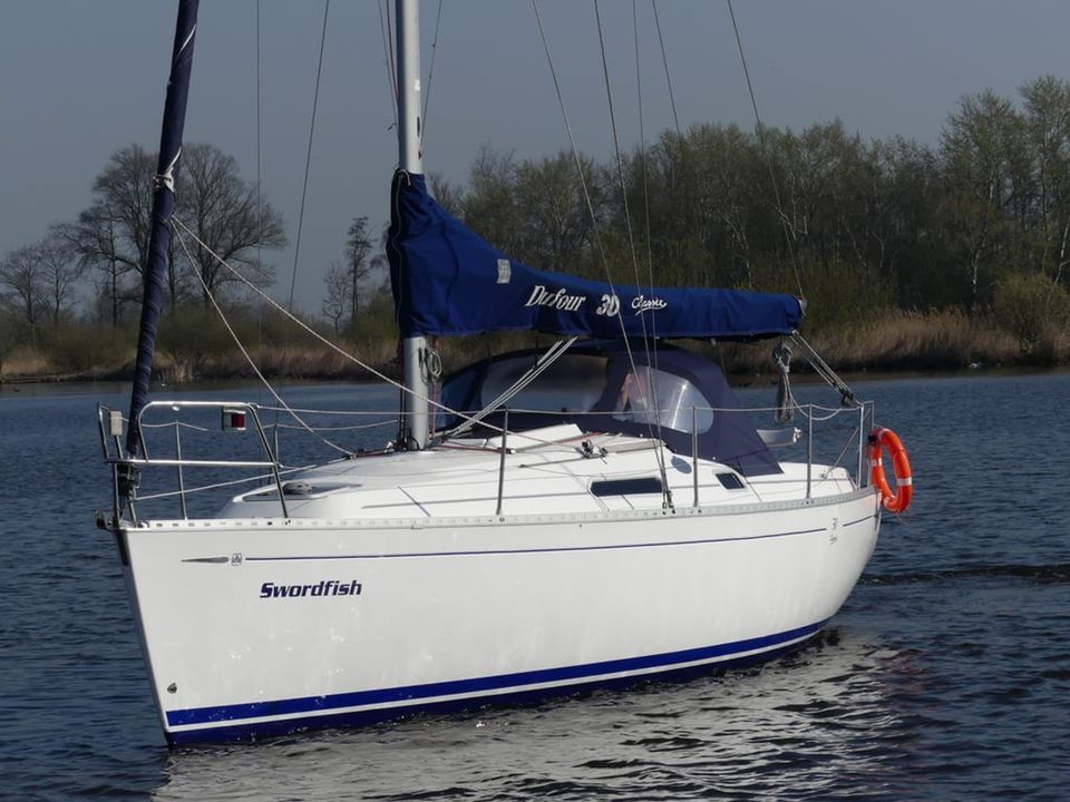 With this modern, spacious family yacht you can sail beautifully in Friesland, the IJsselmeer and the Wadden Sea due to the shallow draft (1.20 m). Interior upgrade and new mattresses in 2021! The mainsail (fast reef) and the Genoa (furling jib) can be operated from the cockpit with the self-tailing winches. Steering is done by means of a tiller. In the cockpit are the speedometer and depth gauge as well as the compass. The cockpit offers space for up to five adults. The gas bottle is safely located outside on the aft deck in the gas well. On board are a VHF radio, radar reflector, lifelines and binoculars. A shower with cold water on the bathing platform and bathing ladder. Docked in a port, you connect the shore power and you have power (220 volts). The cabin of the Dufour 30 Classic has a headroom of 1.80 metres. A spacious seating area that was renovated in 2021, which is also two (extra) sleeping places. The double bed in the tip is extendable. The aft cabin offers sleeping space for two adults, this bed has slatted bases and new luxury mattresses. You must bring your own bed linen, pillows are provided. The hot air heating makes it pleasantly warm on board, even in bad weather. The kitchen is fully equipped with, among other things, sufficient cooking pans, kettle, thermos and complete crockery and kitchen inventory for 4 - 6 people. There is a gas oven and a two burner stove. A deep cool box that retains the temperature for a long time after switching off. The sanitary room has a toilet (manually operated) a sink with cupboard space. There is also a radio-CD player on board. The water charts of Friesland, the IJsselmeer, Wadden Sea (on request) and Almanac are ready on board.