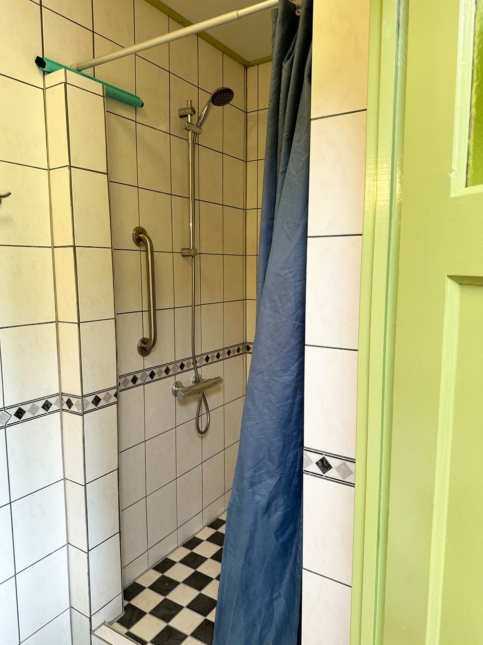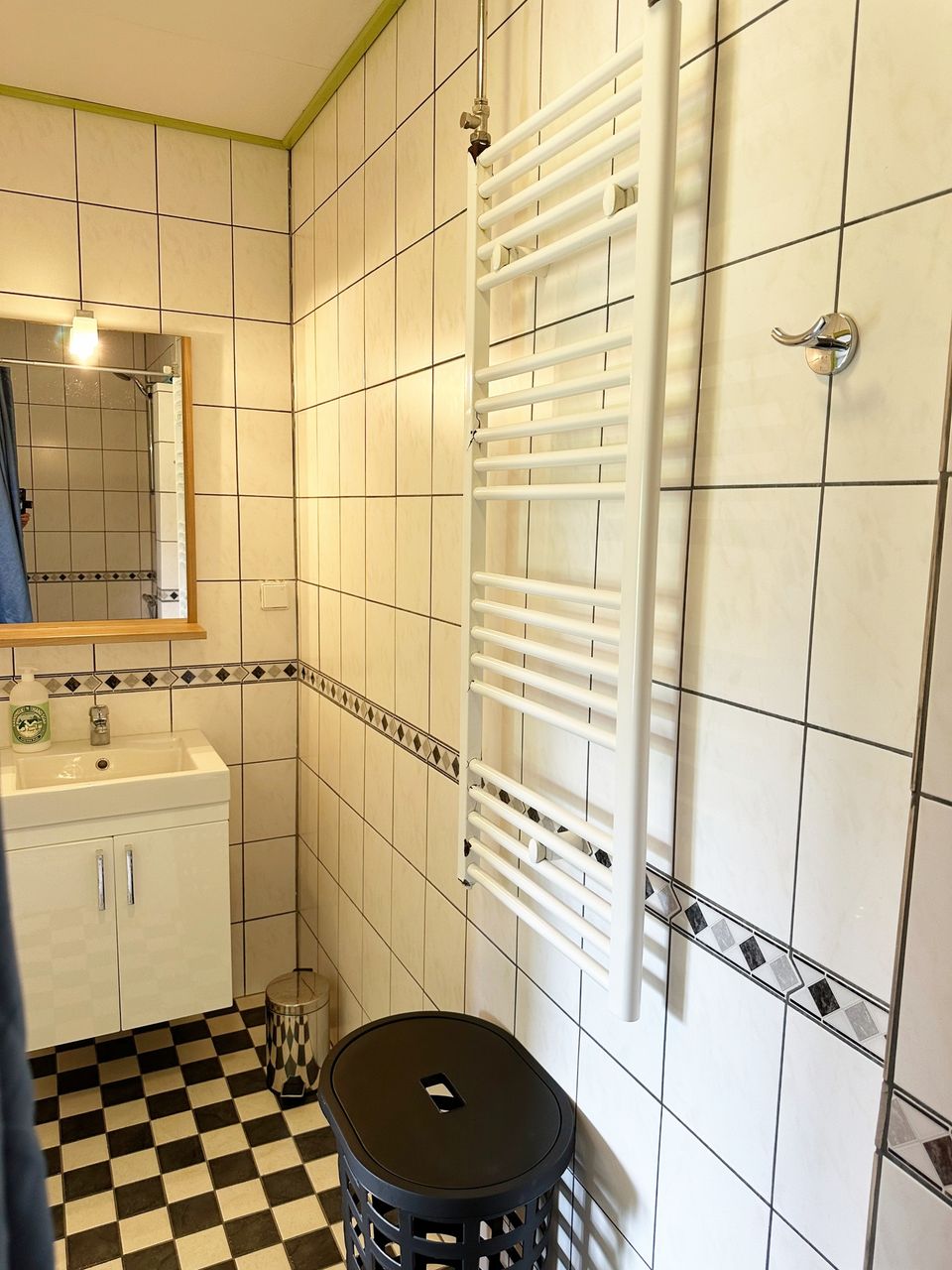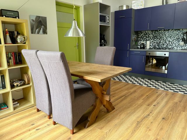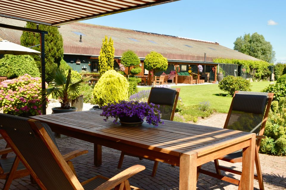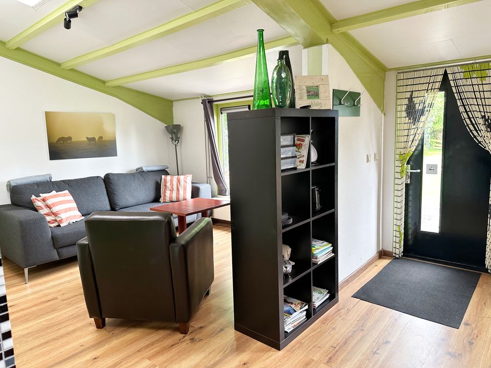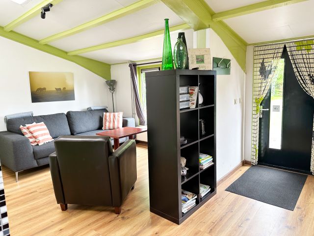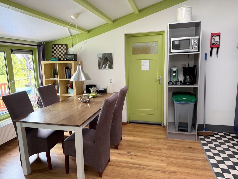 There is an open kitchen with a dining area. The kitchen is fully equipped and includes an oven and refrigerator, among other things. You can store groceries in the freezer in the stable if needed. There is also a cozy living area with a television and radio. Additionally, there is a wide selection of magazines, tourist information, and various cycling route maps.