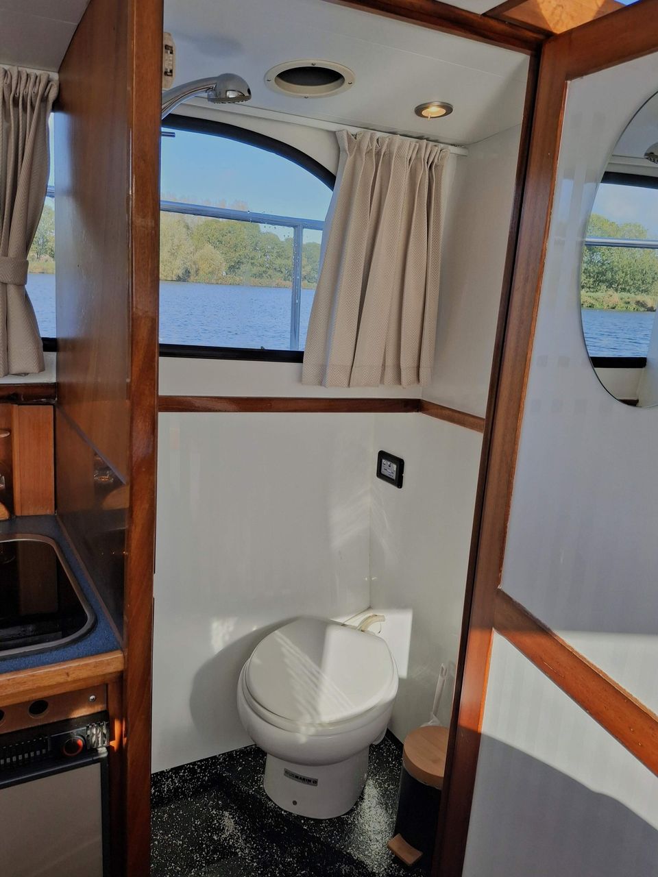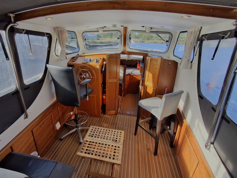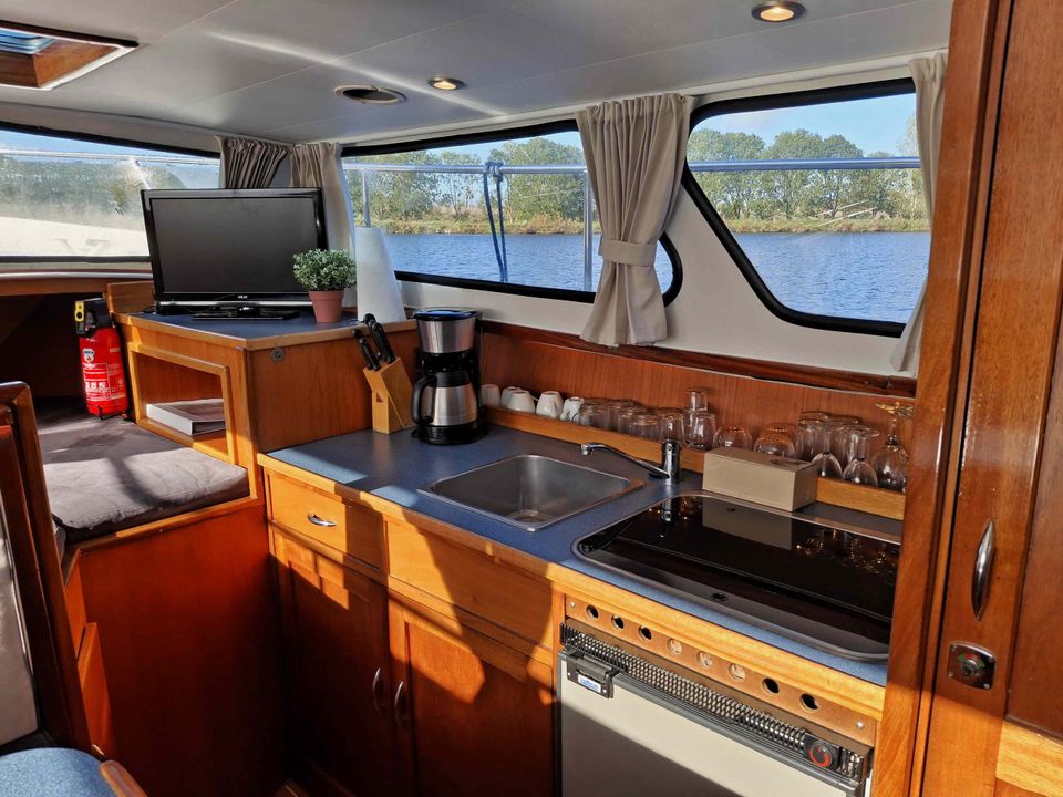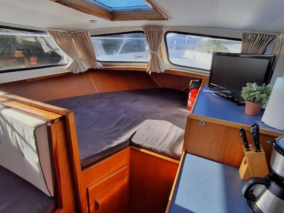 The Jonkvrouw has a low clearance, which means you can often sail under bridges without delay and reach the most beautiful places in Friesland. On board you can benefit from facilities such as 230V via an inverter, a bow thruster, a toilet and a shower. While you glide relaxed over the water, you can enjoy the ever-changing Frisian landscape.
