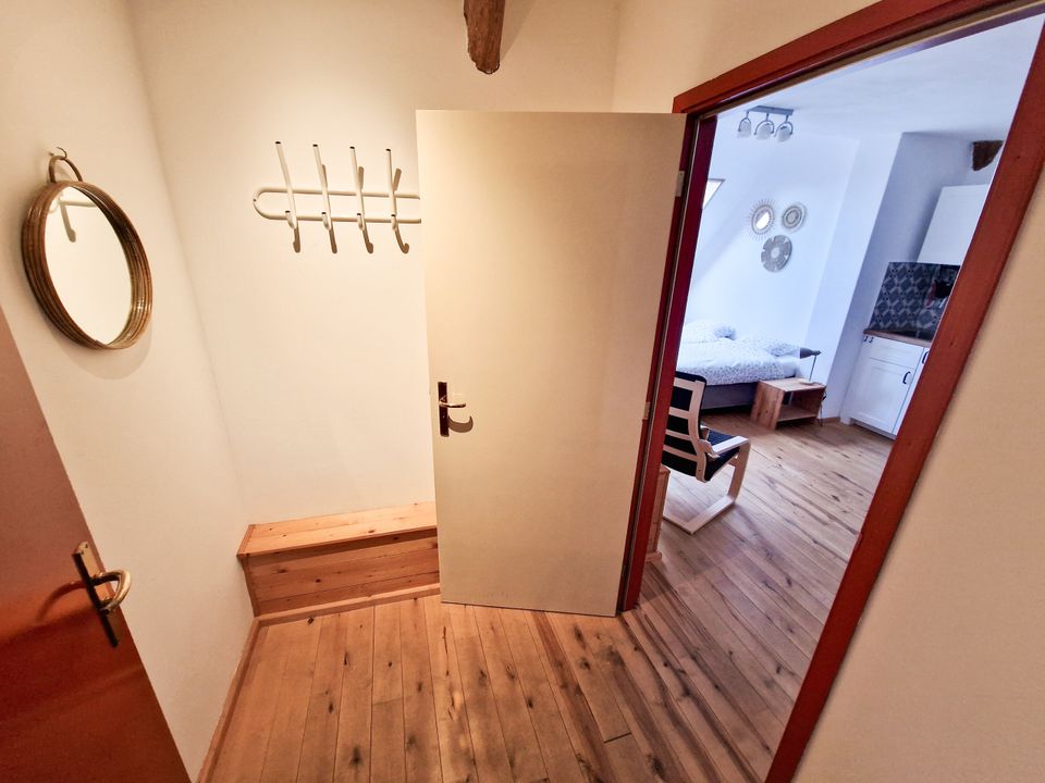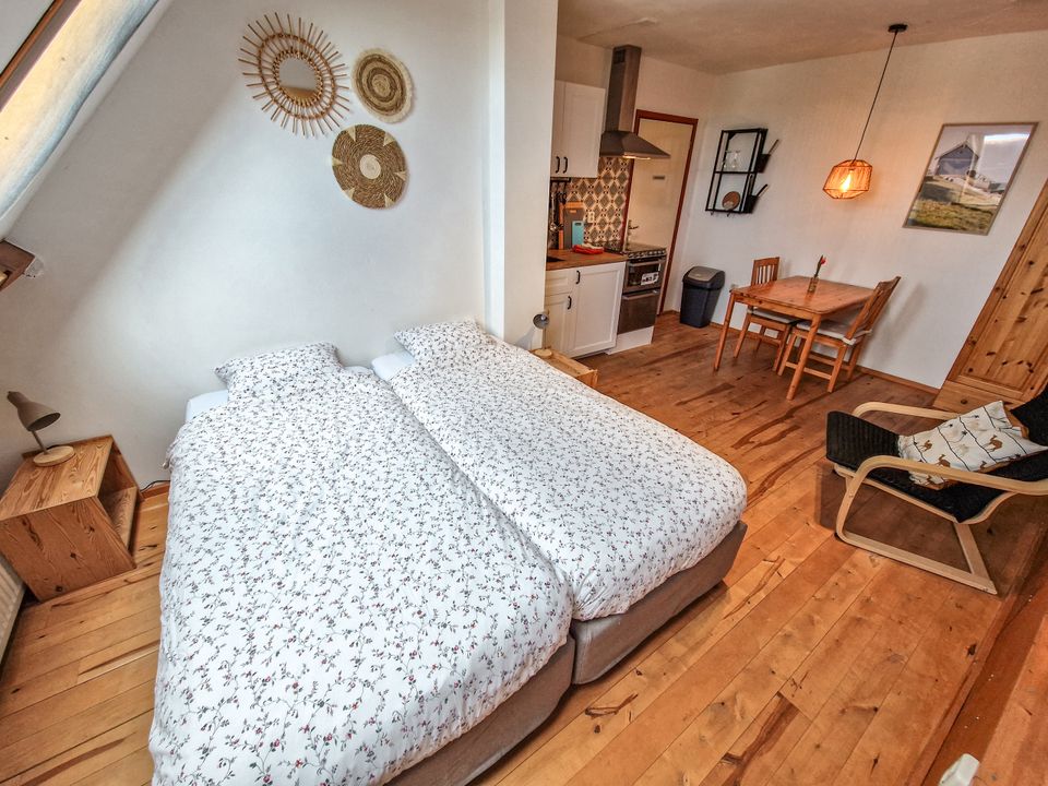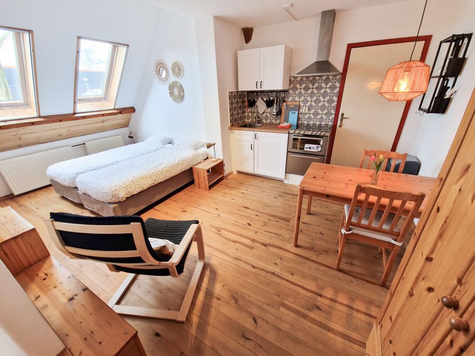 Discover the charm of this Farmhouse Loft: a compact yet charming apartment on the first floor. Everything is in one room, except the bathroom, creating a cozy and inviting atmosphere. The loft is perfect for up to two people and features a double box spring bed, which can be configured as single beds if needed. The kitchen is fully equipped with a dishwasher, oven, and refrigerator with freezer compartment, and the bathroom has a sink, shower, and toilet. The beds are made and ready, and a handy supply of basic necessities (salt, pepper, sugar, coffee, tea, dishwasher tablets, dish soap, paper towels, and toilet paper) is provided. Free parking and Wi-Fi are available. There is no TV in the loft, but a screen with Chromecast is available in the common area if you still want to watch something. Pets are not allowed.