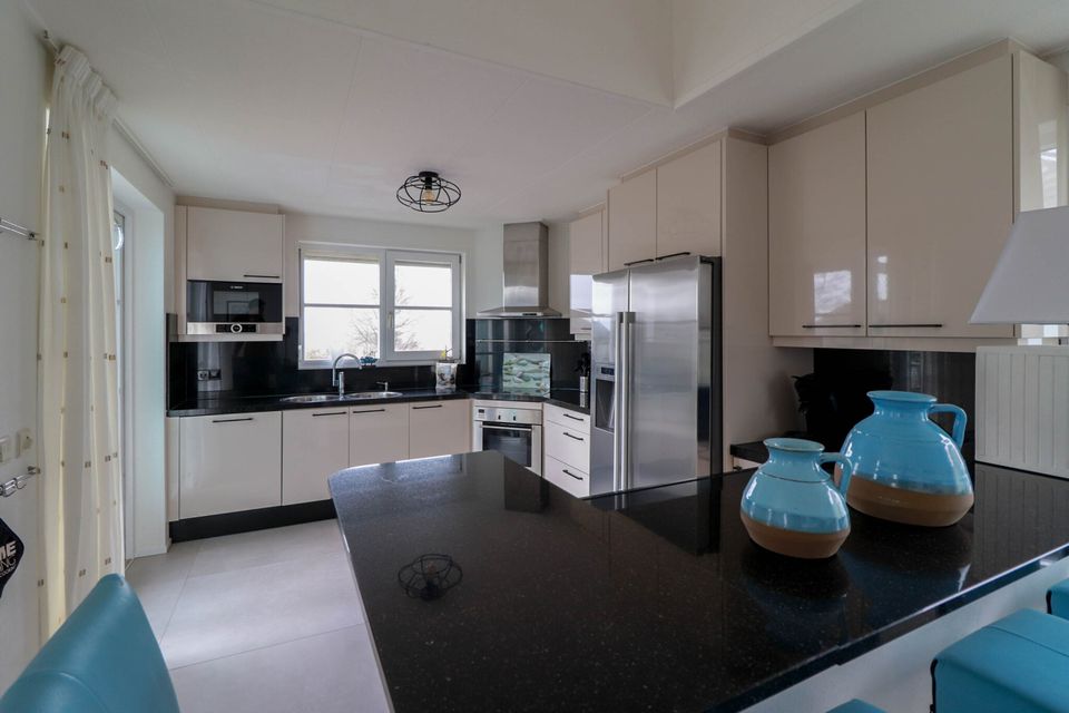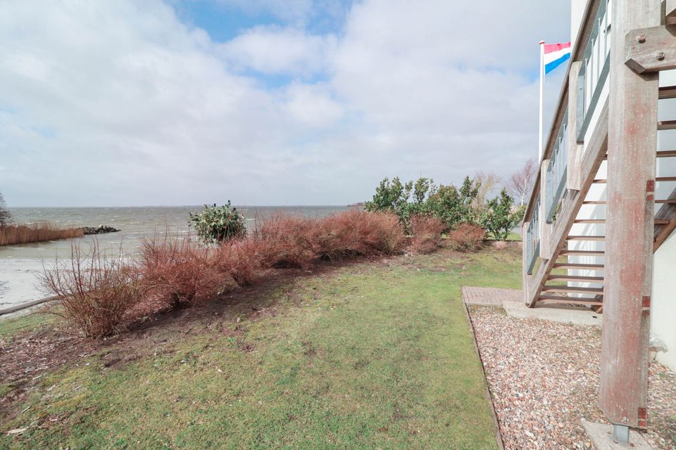 This Beach Villa has a very large living room with an open luxury kitchen on the top floor, where there is also a large sun terrace and you have a beautiful view over the IJsselmeer. The villa has its own driveway suitable for two cars. On the ground floor are four bedrooms, a large luxurious bathroom and the storage room. Three of the four bedrooms have patio doors to the garden. In one of the bedrooms; "the master bedroom" is a freestanding bath and sink. The luxurious bathroom has a sauna, double sink and shower cabin with jets and steam function. In the storage room there is a central vacuum cleaner unit and washer / dryer combination.