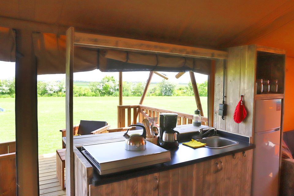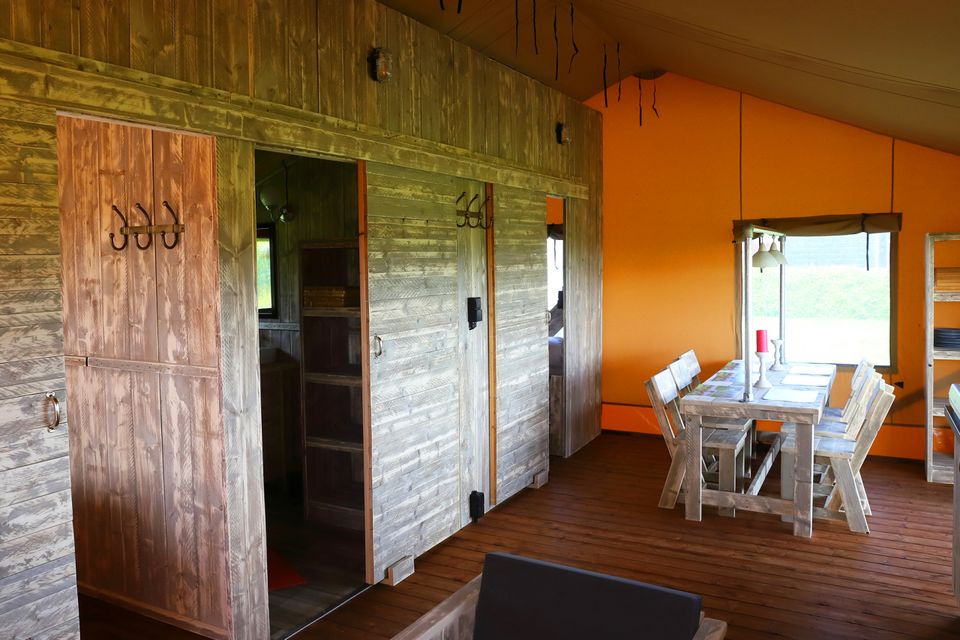 Very quiet location at the end of a road. Comfortable glamping tent. The hosts are a welcoming couple that turned their farm into a camping several years ago.