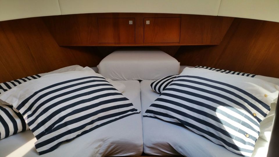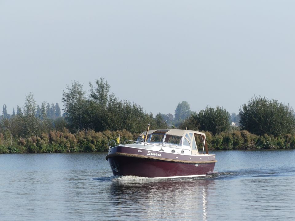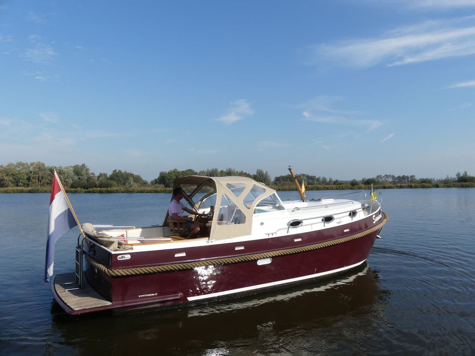 Uniek aan deze boot is de grote open kuip met 2 stuurstoelen, gezellige rondzit en luxe cabriotent. Het zwemplateau met zwemtrap en de douche met warm en koud water. De kuip is voorzien van heteluchtverwarming en LED-verlichting zodat je ook met minder mooi weer kunt blijven doorvaren en genieten. De kuip is zelflozend, heeft veel opbergruimte en walstroomaansluiting. Interieur: Kajuit 1.90 m. Stahoogte. Royaal 2-persoonsbed in de punt met luxe matrassen en lattenbodem (2.40 x 2.20 mtr.). Er is een ruime zithoek, veel kastruimte. Heteluchtverwarming, inbouwspots met dimmer, leeslampjes. LCD-TV met Digitenne, DVD-speler en aansluiting SD-kaartje, Radio/CD. De keuken met compleet inventaris is geschikt voor 4 personen, koelkast (85 liter), 3-pits kooktoestel, waterkoker en koffiezetapparaat, boiler voor warm water, watertank 170 liter. Luxe sanitaire ruimte met elektrisch toilet, wasbak en handdouche. Spoelwater wordt opgevangen in vuilwatertank. Victron omvormer 220 V, zodat je ook tijdens het varen van stroom bent voorzien. Beddengoed dien je zelf mee te nemen of bij ons te huren. Hoofdkussens zijn aan boord. Kaartplotter, Frieslandkaart en de mooiste vaarroutes zijn aan boord.