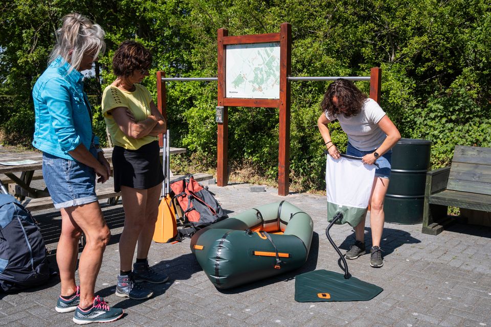 Sylvana wijst naar de rugzakken. “Daar zit alles in: de boot, peddel, zitje en een pompzak. Alles bij elkaar weegt het maar 5,5 kilo.” Brenda tilt nieuwsgierig haar tas op: “Even voelen hoor… O ja, dat valt echt mee!” Dan laat Sylvana zien hoe je de boot oppompt. Niet met een gewone pomp, maar met een grote zak die je vult met lucht en daarna in het bootje perst. “Lijkt gek, hè?”, zegt ze lachend. “Maar het is hartstikke slim bedacht en werkt verrassend goed.” Ze pakt er een plattegrond van de omgeving bij en vertelt over de drie uur durende route. “Jullie wandelen eerst een stuk door het Rijsterbos, daarna gaan jullie het water op en varen richting natuurgebied de Wyldemerk. Vanuit daar lopen jullie weer terug naar hier. Maar voel je vrij om iets af te wijken hoor, neem de tijd, het is jullie avontuur.”