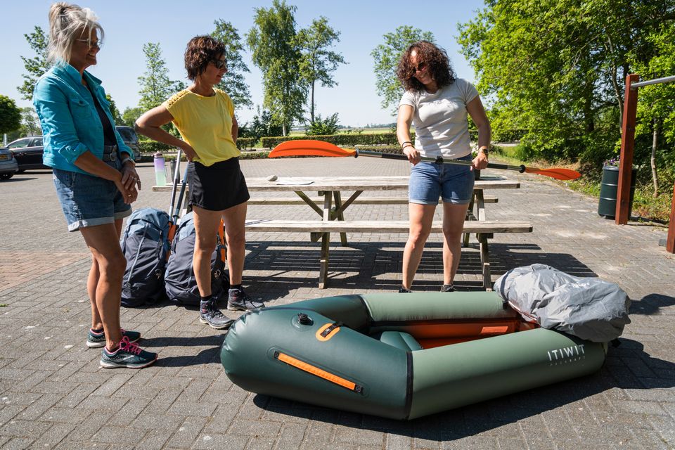 Bij aankomst in Rijs staat Sylvana van Woodssteps al klaar met twee grote rugzakken. Ze glimlacht en zegt enthousiast: “Welkom! Jullie hebben mooi weer meegenomen.” Naast haar ligt een opblaasbootje klaar voor de demonstratie. “Dit is dus een packraft”, legt Sylvana uit terwijl ze het bootje aanwijst. “Eigenlijk gewoon een superlicht opblaasbootje.” Ze vertelt dat packraften oorspronkelijk uit Alaska komt. Daar gebruiken wandelaars het om rivieren over te steken tijdens tochten door de natuur. “Je draagt ’m op je rug, en zodra je water tegenkomt: oppompen en gaan. Zo simpel is het.” Brenda kijkt verrast: “Oh, dat klinkt eigenlijk best logisch. En ook wel leuk, zo’n afwisseling onderweg.”