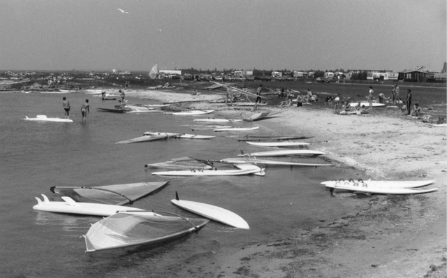 Windsurfers vullen het strand met planken en gekleurde zeilen. Het ondiepe water maakt het strand van Workum tot een ideale plek voor deze sport. Deze foto komt uit de jaren tachtig, 1986 om precies te zijn, het hoogtepunt van het windsurfen in Nederland. Naar schatting waren er toen zo’n 300.000 boards en 500.000 mensen die de sport beoefenden.